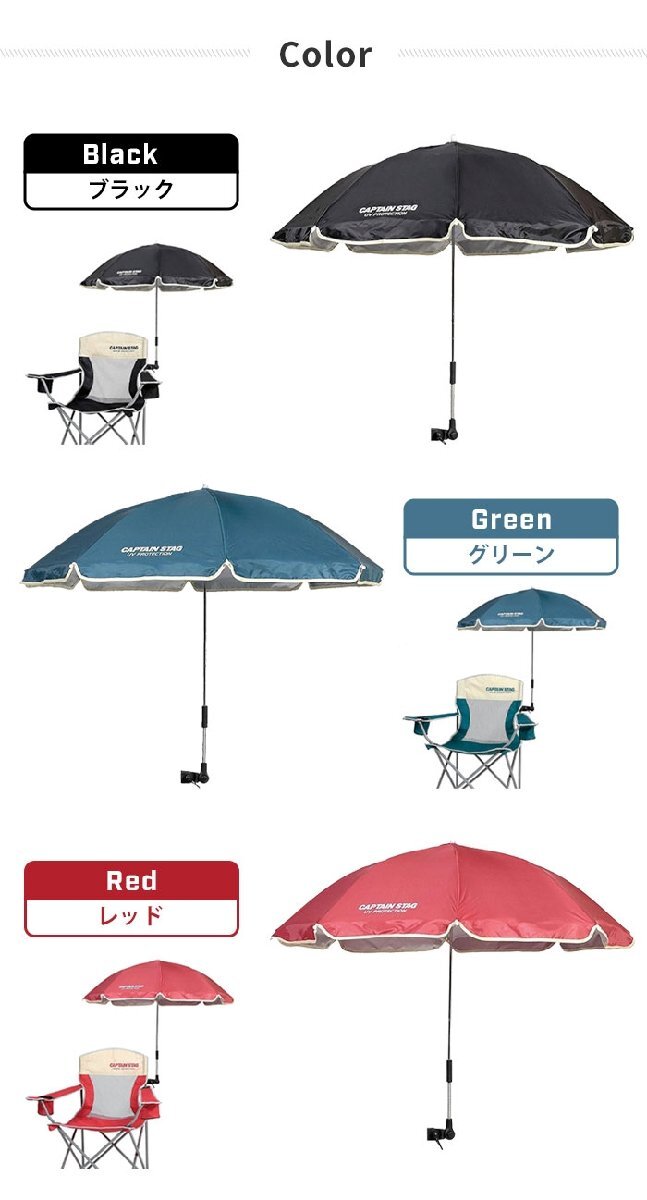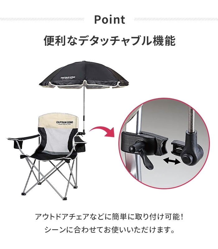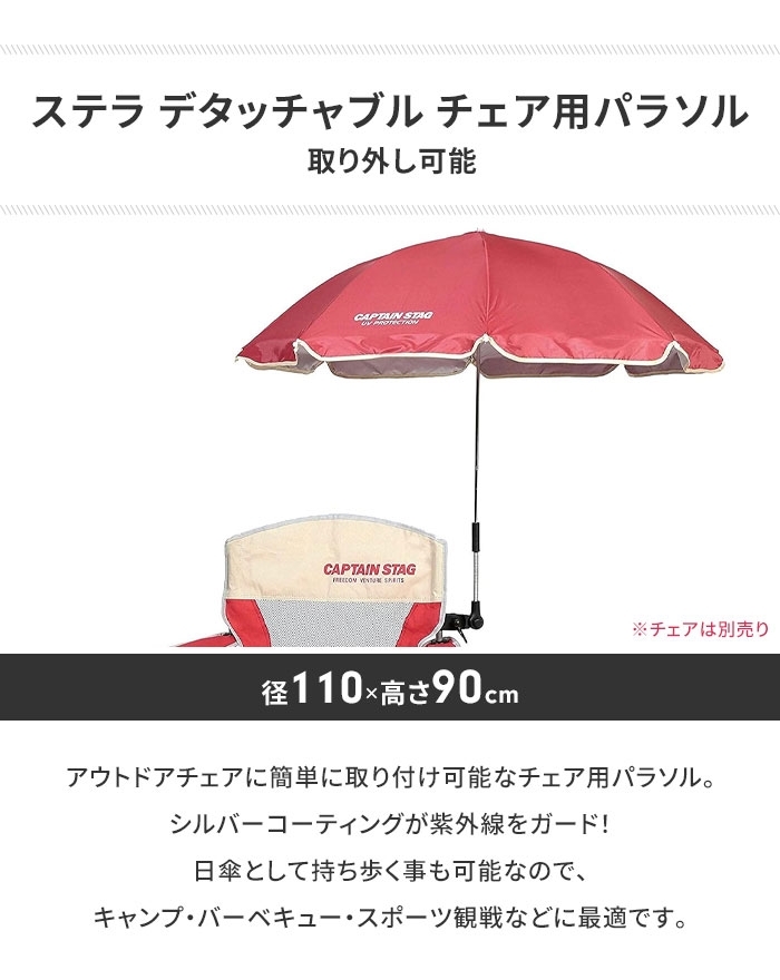 | チェアに簡単取り付け可能。 シルバーコーティングが紫外線をガード。日傘として持ち歩く事も可能。 キャンプ・バーベキュー・スポーツ観戦などに最適。 |