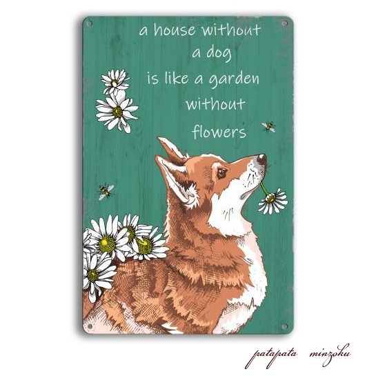コーギー と 花 メタルプレート ブリキ看板 アンティーク調 ウェルシュ・コーギー 犬 ドック 看板