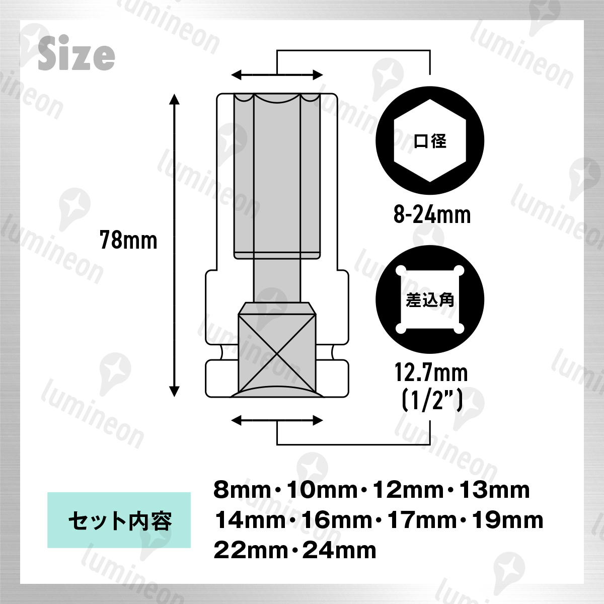 インパクト 用 レンチ ソケット トルク セット ディープ ロング アダプター 8mm 10mm 13mm 17mm 22mm 24mm 12.7 六角 ビット 工具 g296 1