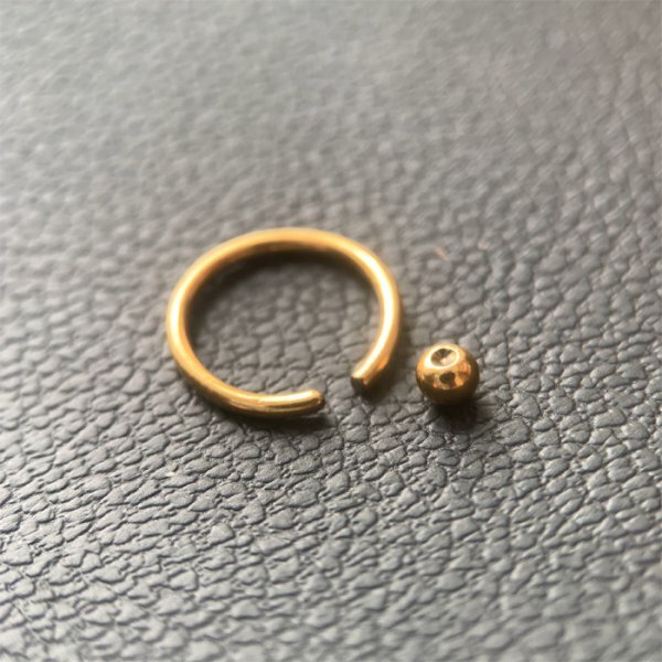 ご覧いただきありがとうございます(^_^) 耳だけでなく軟骨部分や口、鼻など、幅広い部位に装着可能な人気のキャプティブビーズリングピアスです。キャッチのボールに窪みがあり、そこにリングをはめてお使いいただくアイテムです。 金属アレルギーにも強いステンレス製でお手入れも簡単です。 新品未使用品 <商品仕様について> ■ 素材 : ステンレススチール ■ カラー:ゴールド(他のカラーも出品しております) ■ サイズ 外径:約12.4㎜ 内径:約10㎜ 幅:約1.2㎜(16G) ※こちらの商品はノーブランド品になります。 ※ばら売りです。 ※新品・未使用ですが、製造過程における細かなキズ等がある場合がございます。素材の特性をご理解の上、ご落札下さい。 他にも出品しております。よろしければご覧ください。 よろしくお願いいたします。 | |||