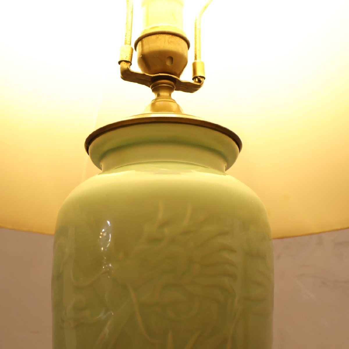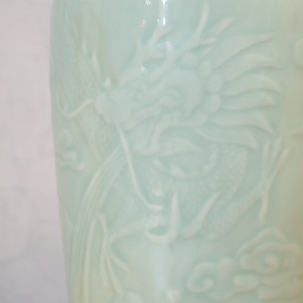 柔らかなグリーンカラーの陶器製のベースに細かく施された浮き彫りのような装飾が