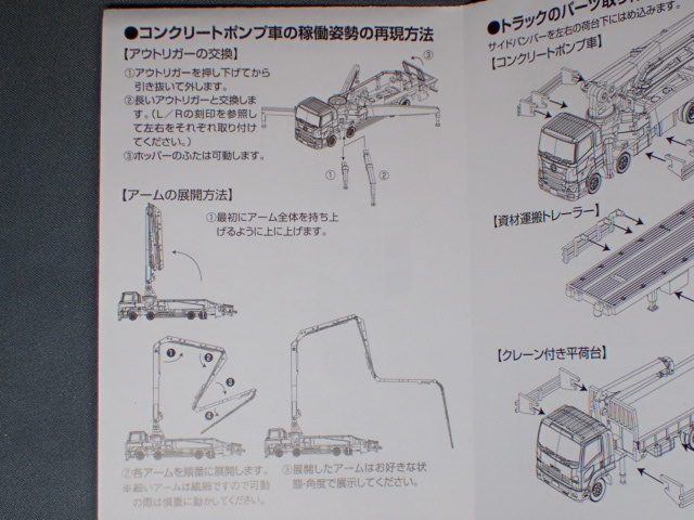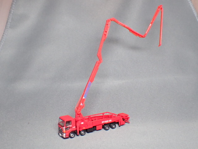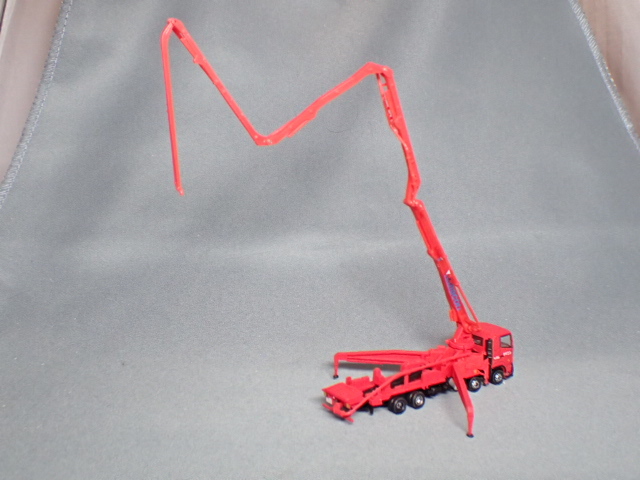 ブーム車と折りたたみ式のブームを用いてコンクリートを高所へ輸送することができるトラックのことで、模型では39m、5弾ブームを再現しています。