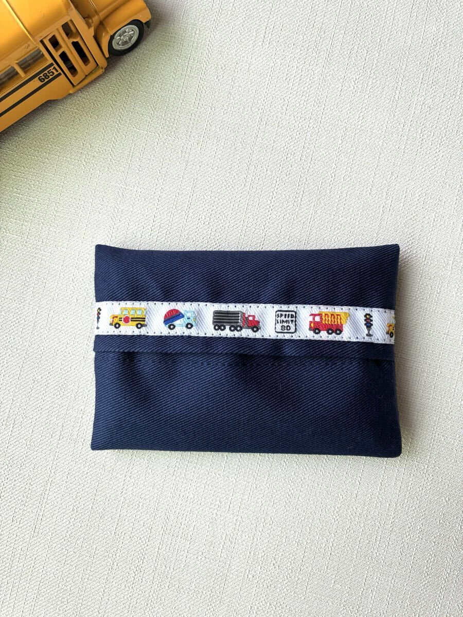 はたらく車のチロリアンテープがポイントの、ミニポケットティッシュカバーです。