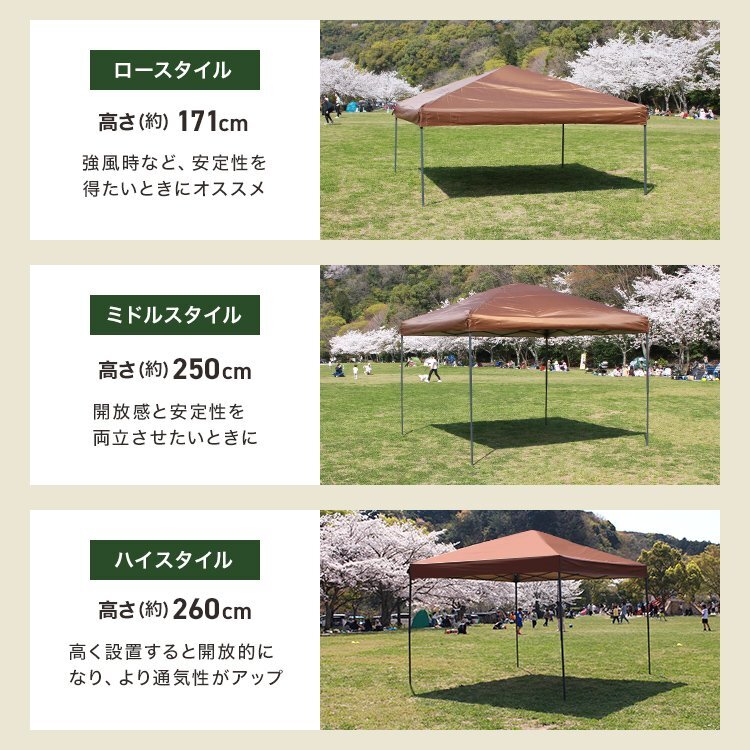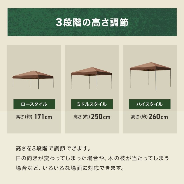 コンパクトなサイズ300×300cmのワンタッチタープテントです。 組み立てはワンタッチで簡単! 大人2人で持ち上げてゆっくり広げるだけ! フレームは強度で耐久性のあるスチール製を採用! アルミ製より少し重いですが、強度で安定性があります!! 急な雨が降っても安心の撥水加工が施されており、大人数のバーベキューやスポーツ観戦、アウトドア、休憩所にぴったり。 シーンに合わせて3段階で高さ調節が可能です。 持ち運びに便利な専用収納バック付き! 【商品仕様】 カラー:オレンジ 商品サイズ(約): ・使用時:幅300×奥行300×高さ260cm ・収納時:幅120×奥行21×高さ21cm 材質:スチール、ポリエステル 重量(約):11kg 【商品内容】 タープテント本体 ロープ ×4 ペグ ×8 専用収納ケース 【注意事項】 ・テント生地には撥水加工が施されていますが、雨天・豪雨下での完全防水を保証するものではございません。 ・風速5m以上の風の吹く場所でのご使用は、転倒や破損の原因になります。 ・設営の際は、2人以上で丁寧に作業を行い、しっかりと固定してください。乱暴に扱いますと、故障や破損の原因になります。 ・海外製品で、簡易梱包での輸入のため風防に擦れや多少の小キズなどがある場合がございますが、商品自体には問題ありませんのでご了承下さい。 ・商品は、モニターによって色合いが異なって見える場合があります。 ・仕様・デザインは改良のため予告なく変更することがあります。 |