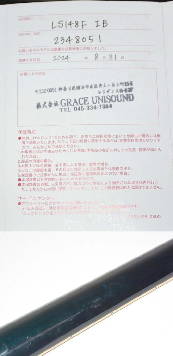 中古楽器(弦楽器、管楽器等)の場合、全てのコンディションの把握が難しく、 更にコンディション判断につきましては主観や各々の判断基準も異なります。 また、ヴィンテージ楽器等でパーツ交換部分、 修理歴、補修歴、カスタム歴等全ての把握が難しく 弊社の判断により返品・キャンセルを お断りさせて頂く場合もありますので、予めご了承下さい。 細かな部分でパーツが交換されていた場合、 説明に無かった小さな塗装剥がれや打痕、小キズがあった場合等に関しては 返品・キャンセルは受け付けできません。 トラスロッドについては現状コンディション維持の為、 又、「トラスロッドには触ってほしくない」というご指摘を多数頂いておりますので、 ロッドの状態については確認しておりません。 商品の状態を極力正確にお伝えできるように現状確認を行っておりますが、 正常な状態であっても、ピッキングの強い方、ピックの入射角、 弾き方によってビビり、音つまりが発生する可能性があります。 演奏等をしていただけない状態でのお取引となりますので、 その点をご理解、ご了承頂ける方のみ入札を頂けますよう、宜しくお願い致します。 目立つ傷などはできる限り、画像、説明文に記載致しますが、見落としがある可能性もございます。 画像に載っている以外の傷がないことを保証するものではございません。 目視では認識できても、画像では伝わらない傷がある場合もあります。 現物を確認できない画像を通してのお取引であること、2次流通品、中古品という点をご理解頂きます様お願い致します。 ディスプレイによって実際の商品と画像の色の写り方が異なる場合がございますのでご注意ください。 外装状態の基準は、当方スタッフの主観となりますので目安としてお考え下さい。 キズ、汚れの状態に関しては極力記載しておりますが、 個人差がございますので、コンディションを理由とした返品は お受け出来ませんので予めご了承下さい。 商品画像を参照してご検討お願い致します。 ボディー内部など手が届かないところの分解清掃は行っておりませんのでご了承下さい。 付属するものは記載致しますが、 付属しないものは記載しておりませんので、予めご了承下さい。 「ジャンク・現状販売・ノークレームノーリターン」と記載のあるお品物においては、 検品、動作確認など詳細な確認を行っていない商品になりますので、以下記載にご注意ください。 商品状態は当社出品時の状態を画像、説明文にてできる限りくわしく記載しておりますが、 記載内容、動作を保証するものではございません。 お手元に商品到着時に状態が変化している場合もございます。予めご了承ください。 万が一、記載以外の不具合が発覚した場合はお客様で調整、修理等の対応をお願い致します。 上記記載をご理解、ご了承の上、ご入札お願い致します。 気になる点がありましたらお気軽に質問して下さい。宜しくお願い致します。 |