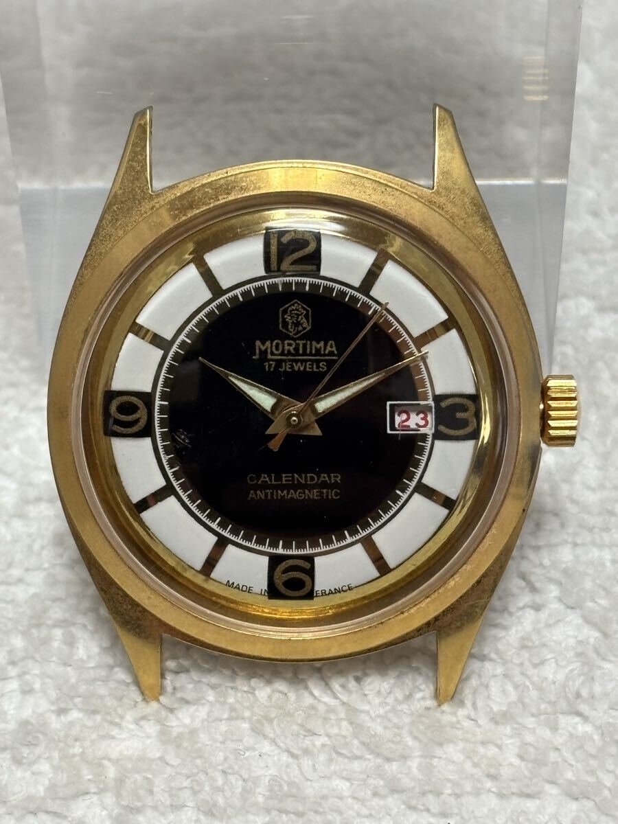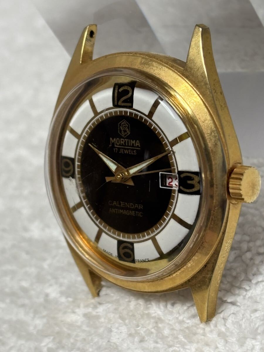 1円〜【稼働品】MORTIMA モルティマ デラックス 手巻き デイト ブラック×ホワイト メンズ 同梱不可