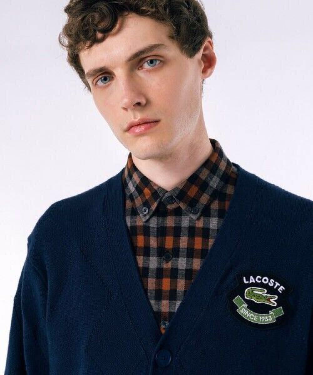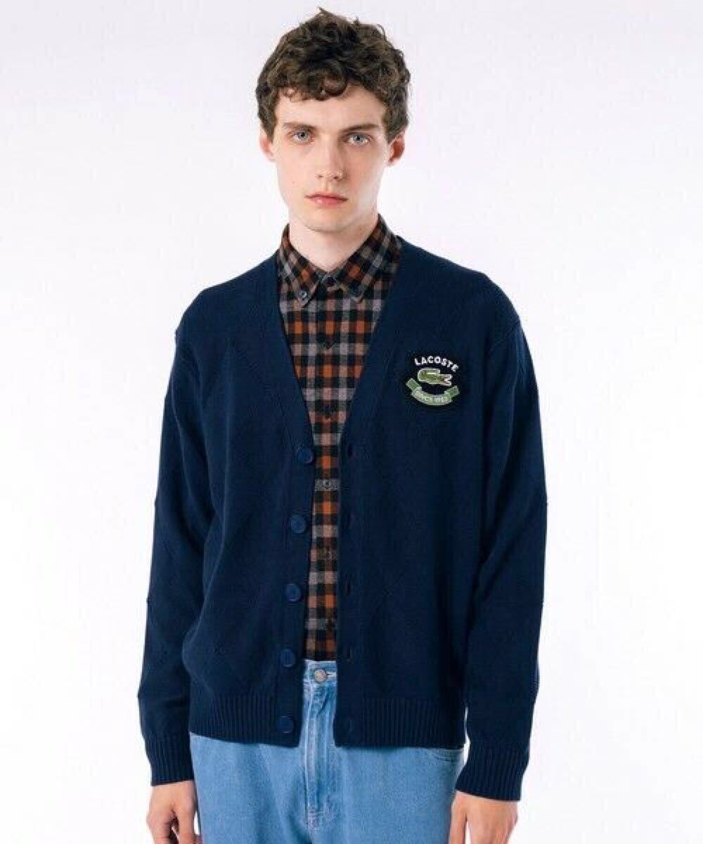・胸のパッチが際立つプレッピーなカーディガンデザイン