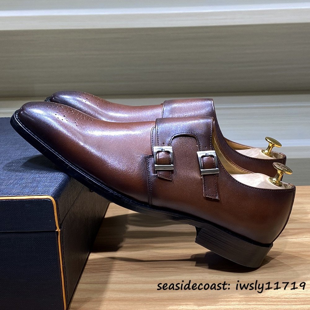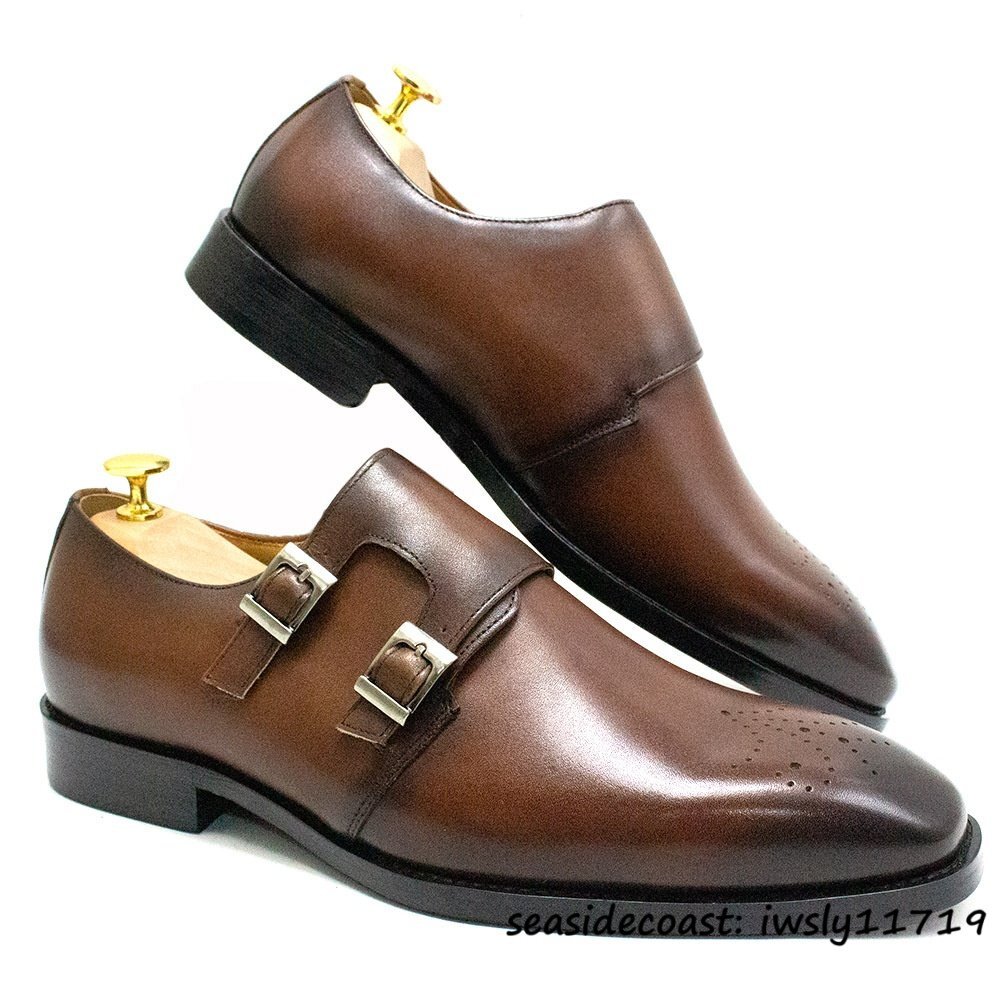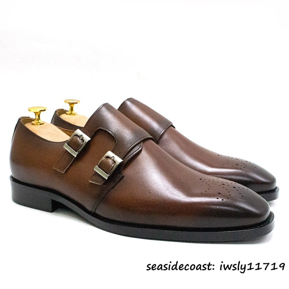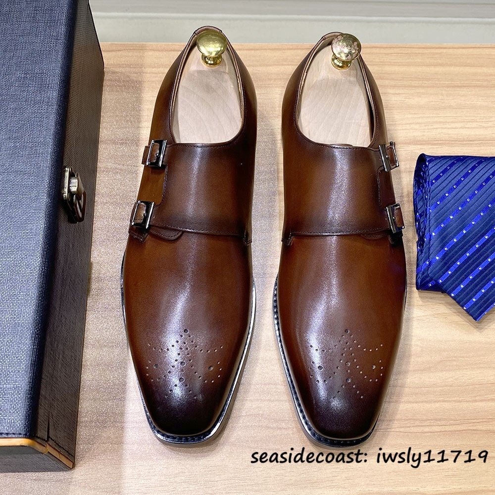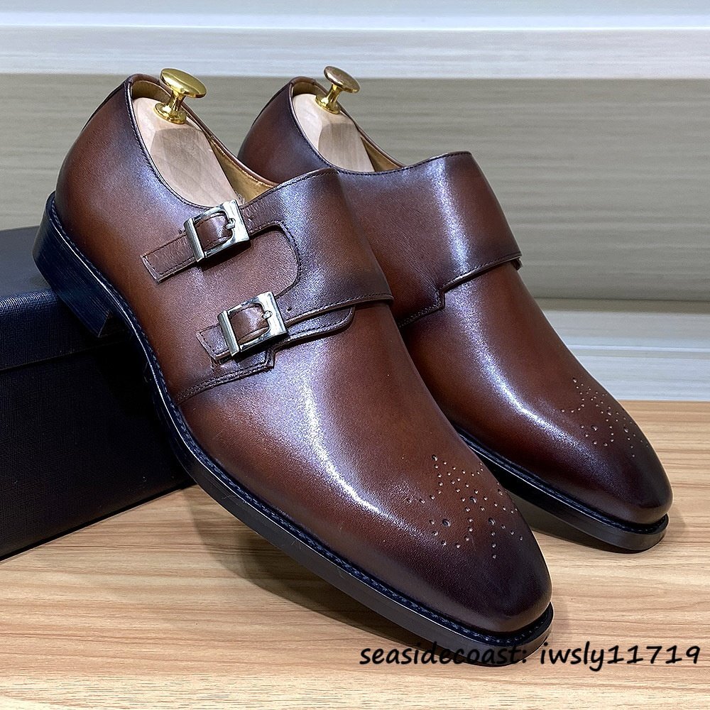 超希少■ビジネスシューズ メンズ ダブルモンクストラップ 本革 レザーシューズ 職人手作り 高級牛革 革靴 紳士靴 結婚式 ブラウン 26.0cm