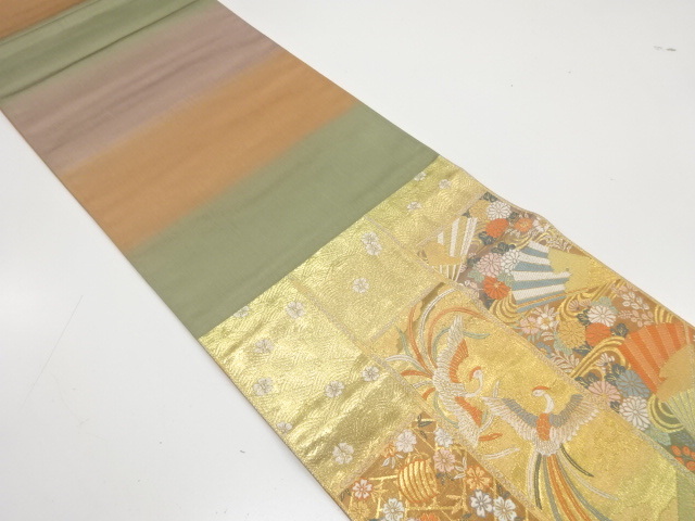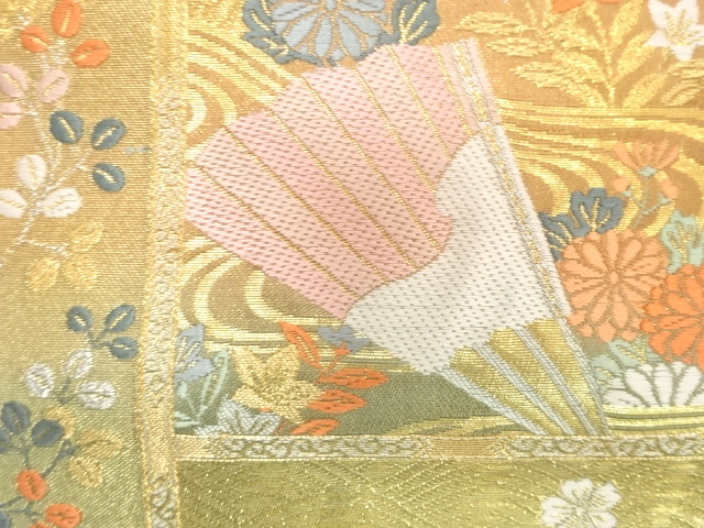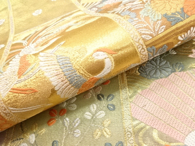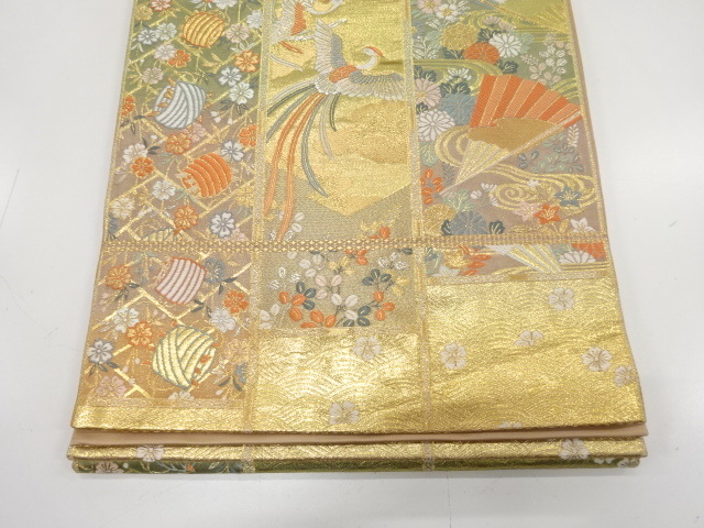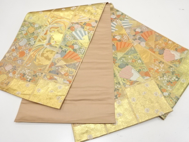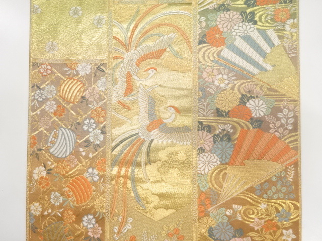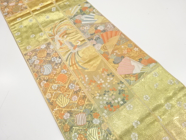 美品 鳳凰に扇・糸巻き・草花模様織り出し 袋帯 (AAD1K-013)