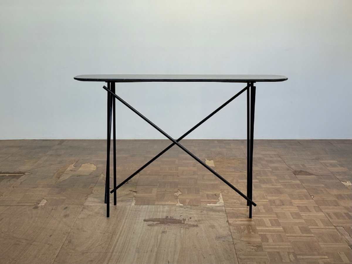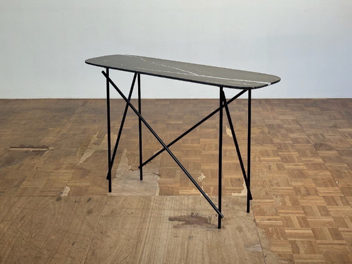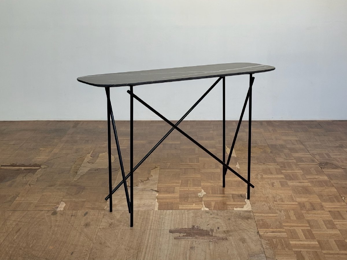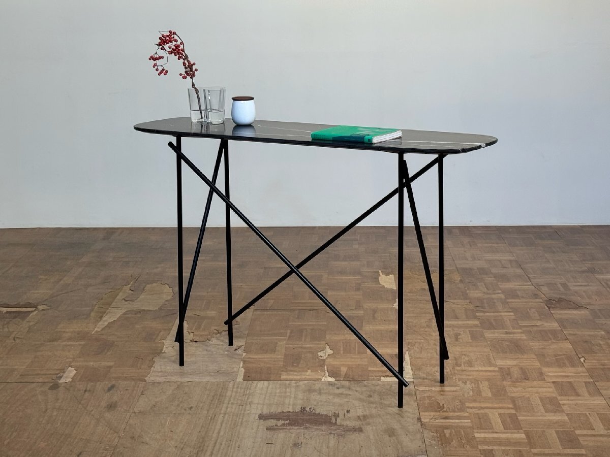 重厚な最高品質大理石材・Black Marquina Marble / ブラックマルキーナ大理石とほっそりとしたスチールポールの造形で、プロダクトデザインの重心バランスを巧みにコントロールして角度によって表情の変わる芸術的な構成に落とし込んだ、あらゆるデザインカテゴリと共鳴する普遍美を追求したコンソールテーブルボードラック。THE CONRAN SHOP. より。