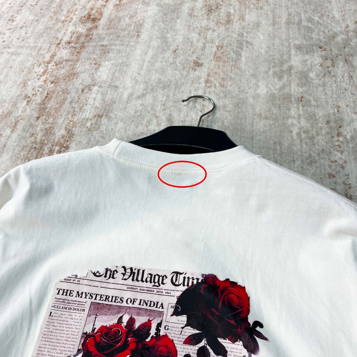 背中に大きく描かれたローズのプリントが目を惹く華やかなアクセントに。フロントにはさりげない英文ロゴを配置し、シンプルながらも都会的な印象を演出しています。首元はベーシックなクルーネック仕様で、顔まわりをすっきりと見せてくれるのも嬉しいポイント。