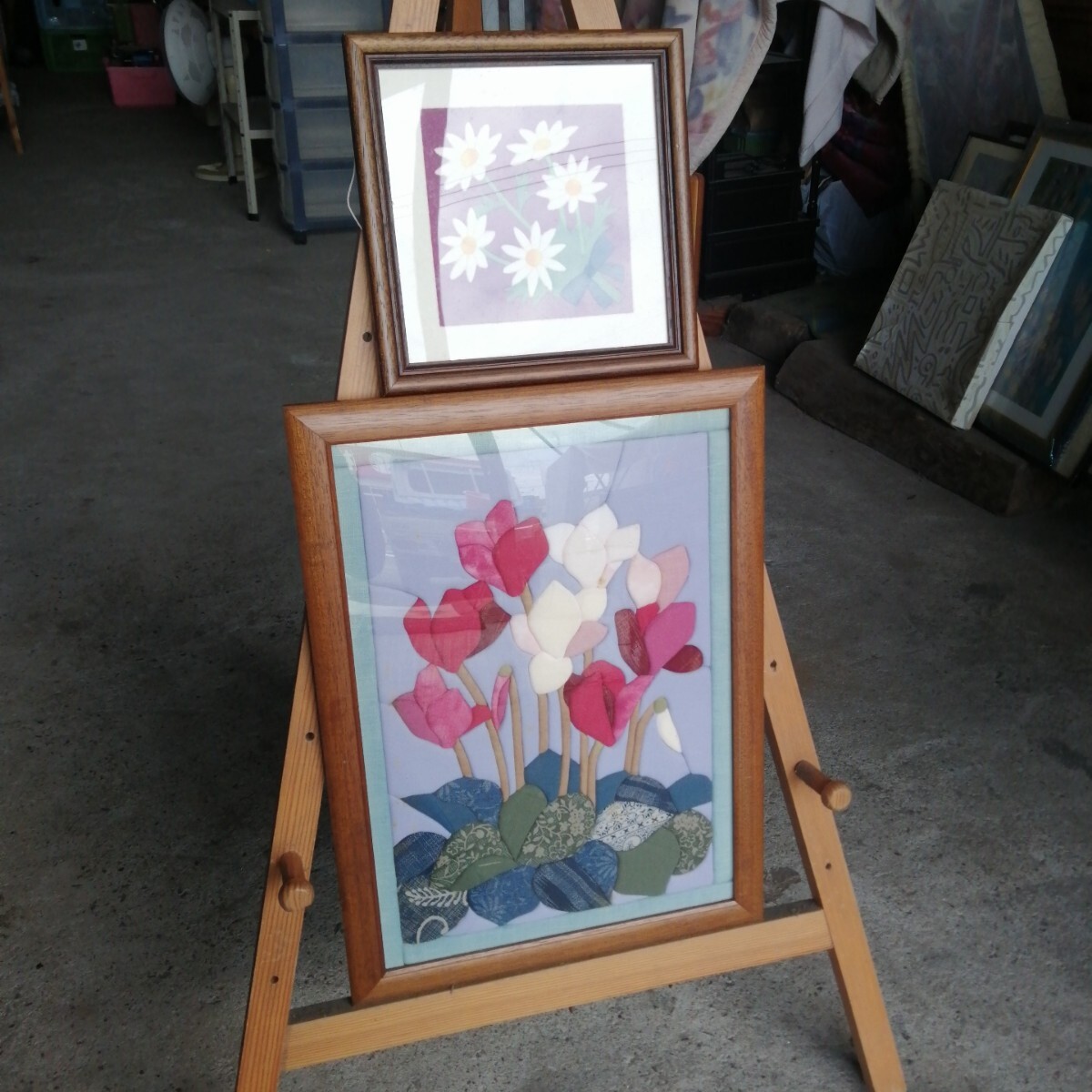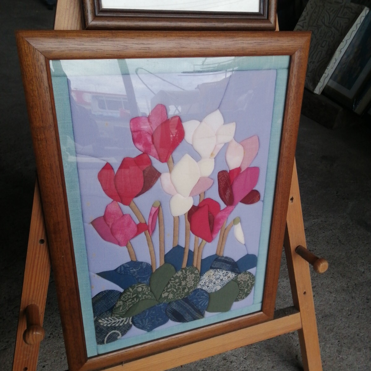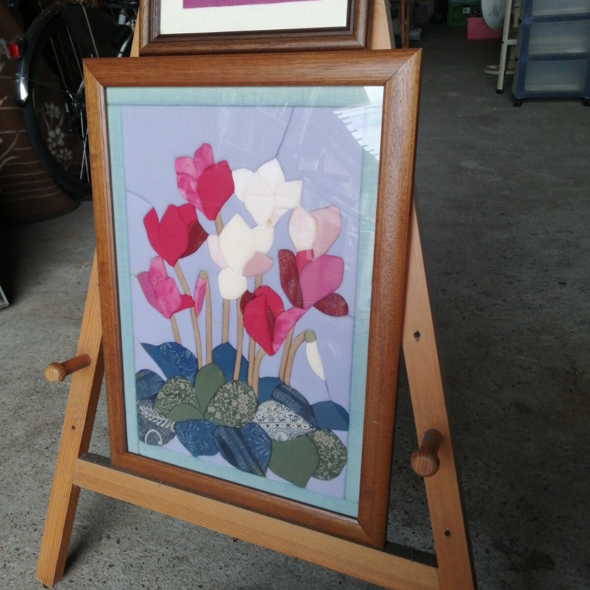 計2個 きめこみパッチワーク 額装 シクラメン 花 華 布 (約470×346/230×230mm) 美術品