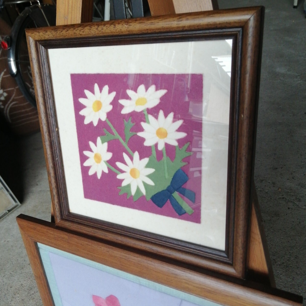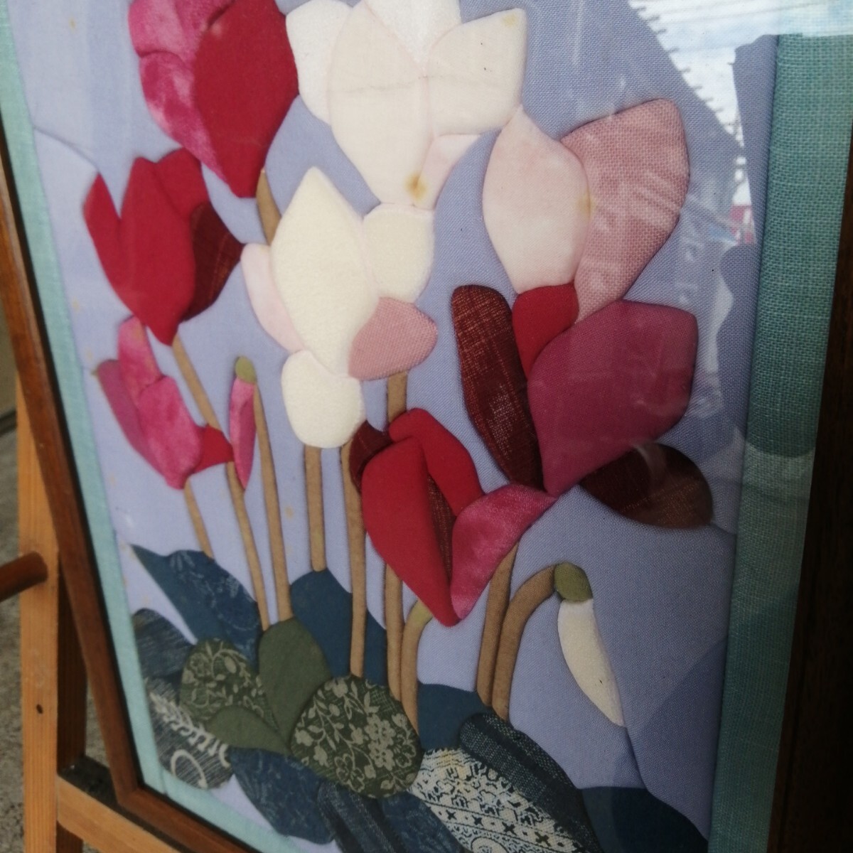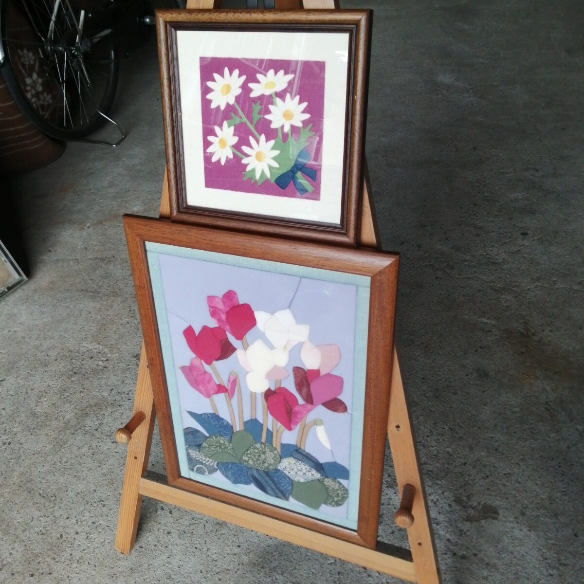 計2個 きめこみパッチワーク 額装 シクラメン 花 華 布 (約470×346/230×230mm) 美術品