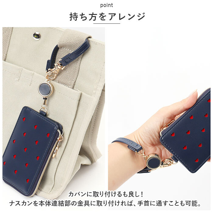 | 商品説明 | ・・通勤・通学の必需品!使い勝手の良い、リール付きパスケースが新登場。 ・【スリム&軽量設計】 ・薄くて軽いので携帯しやすい!使わない時は、バッグにもサッと忍ばせておけるパスケース。 ・【スマートにタッチ&ゴー♪】 ・ぐ~んと伸びるリール付き。改札でも手間取らずスムーズにタッチOK♪ ・【持ち方をアレンジ】 ・カバンに取り付けるも良し!ナスカンを本体連結部の金具に取り付ければ、手首に通すことも可能。 ・【2つのポケット付き】 ・L字に開くファスナーポケットには、小銭や鍵をIN。背面のクリアポケットには、ICカードなどを収納。 ・【お気に入りをチョイス】 ・シンプルな無地カラーや、型抜きデザインなどをラインナップ。カラーにより異なる質感などもポイント。 |