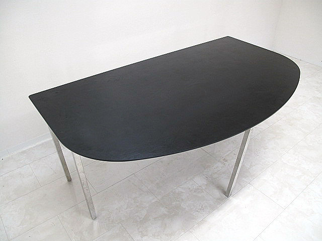マットブラックの天板は光を柔らかく吸収し、空間全体を引き締める静謐な存在感を放ちます。幅180cm・奥行100cmの広々としたサイズは、6人での食事や会議にも最適。シャープなメタルフレームが軽やかさを演出し、重厚さと開放感を美しく両立しています。