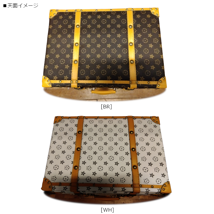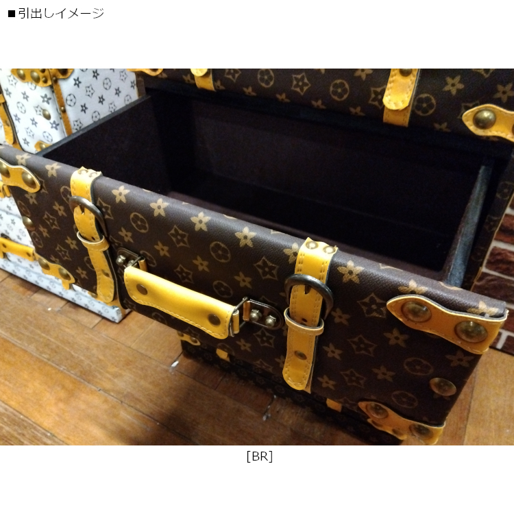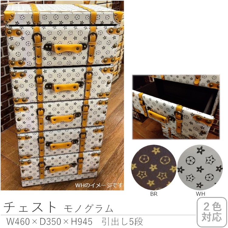 モノグラム柄のトランクデザインの存在感のあるチェストです。引出しが5杯で、収納力もたっぷり。ベルトや鋲、ハンドルなど、デザインにこだわった個性的なチェストで、お部屋のワンポイントに。カラーはブラウンとホワイトの2色、同シリーズで4段もあり、空間コーディネートが楽しめます。