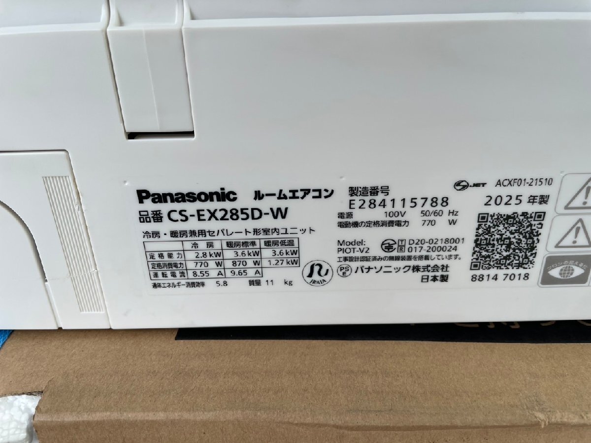 パナソニック エアコン Eolia EXシリーズ クリスタルホワイト CS-EX285D-W [おもに10畳用 /100V] 2025年製造 キャンセル品の出品となります。状態は一度お客様宅に取り付けに伺ったのですが、ご注文間違いによりキャンセルとなった商品となります。交換までの短期間のみご使用いただいておりますが、写真のように使用感もなく新品同様かと思います。在庫処分につき最低落札価格なしの1000円スタートでお願いいたします。落札価格に別途消費税がかかります。保証書に個人情報の記載がございましたのでお付けできないため、現状渡し、ノークレーム・ノーリターンでお願いいたします。また、ガスにつきましては目視にて確認が取れないため保証はございません。不足が生じて充填、補充等が必要な場合は落札者様のご負担にてご対応をお願いいたします。発送できる付属品は写真に写っているものですべてとなります。よろしくお願いいたします。