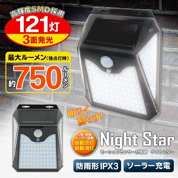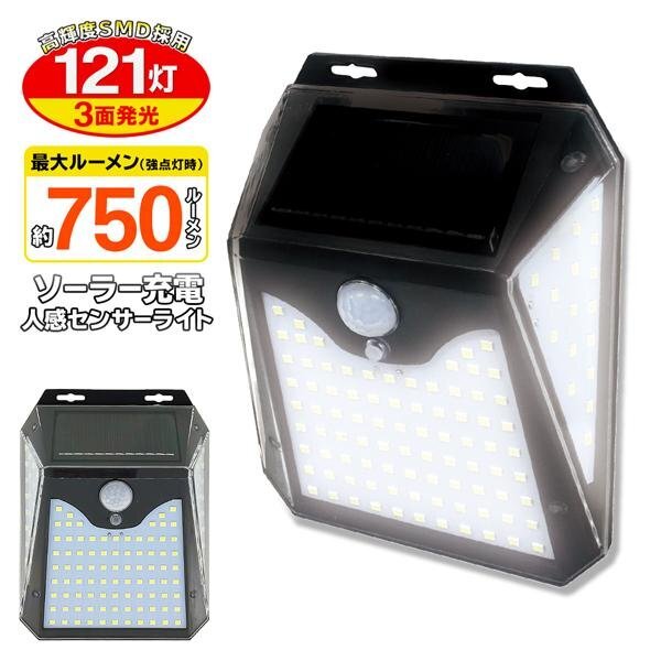 センサーライト LED 121灯 ソーラー 750lm 人感センサー 自動点灯 消灯 防雨型 3面発光 ライト 新生活 送料無料- 60N◇ 121灯ライトT