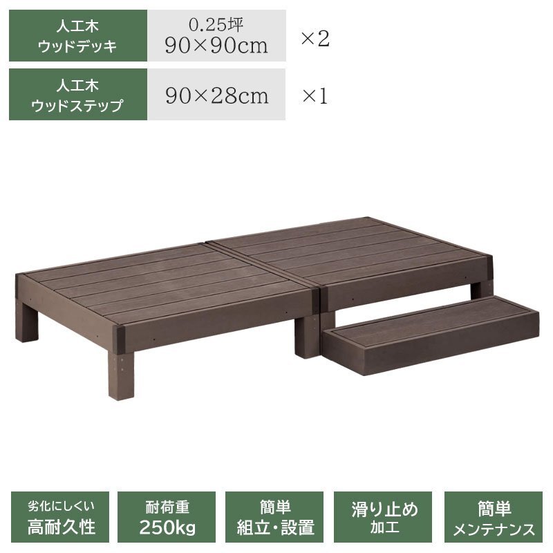 ウッドデッキ ウッドステップ 3点セット 人工木 樹脂製 90×90cm×28cm 90×28cm×10.5cm ダークブラウン 小上がり 高耐久性