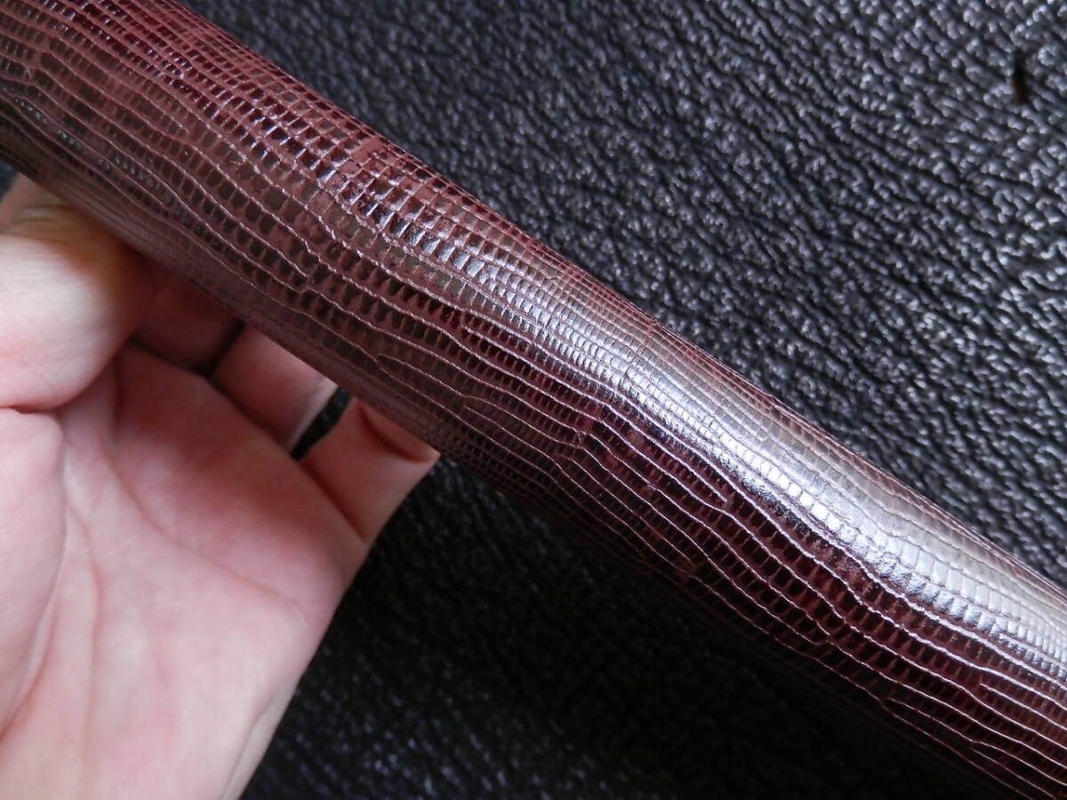 | リザード、トカゲの腹部の型押し模様となります この革はリザードの腹部分の模様がキューを立てて縦に走ります リザード型押しの定番的革ですね カット違いの横模様もございます お好みでどうぞ(*^-^*) 型押しがほどよく手に伝わってきます ほとんどのキューに使用できると思いますが、ご自分のキュー のグリップサイズをご確認ください 革の種類 : 牛革 模様 : リザード、トカゲ 腹部型押し 縦模様 柔らかさ : 普通~やや張りあり 柔1-2-3-4-⑤-6-7-8-9-10硬 握り心地 : スルスル、本革ならでは サイズ : 短径 10.5cm 長径 32.8cm 厚み 約0.6mm前後 ロングサイズ : なし *初心者の方には革巻き工程ガイドをお付けいたします (雑誌のコピーですが)お気軽にお申し付けください 革の種類によっては複数在庫もあります お取り置き、同時梱包も預かります、お気軽にお申し付けください | ||