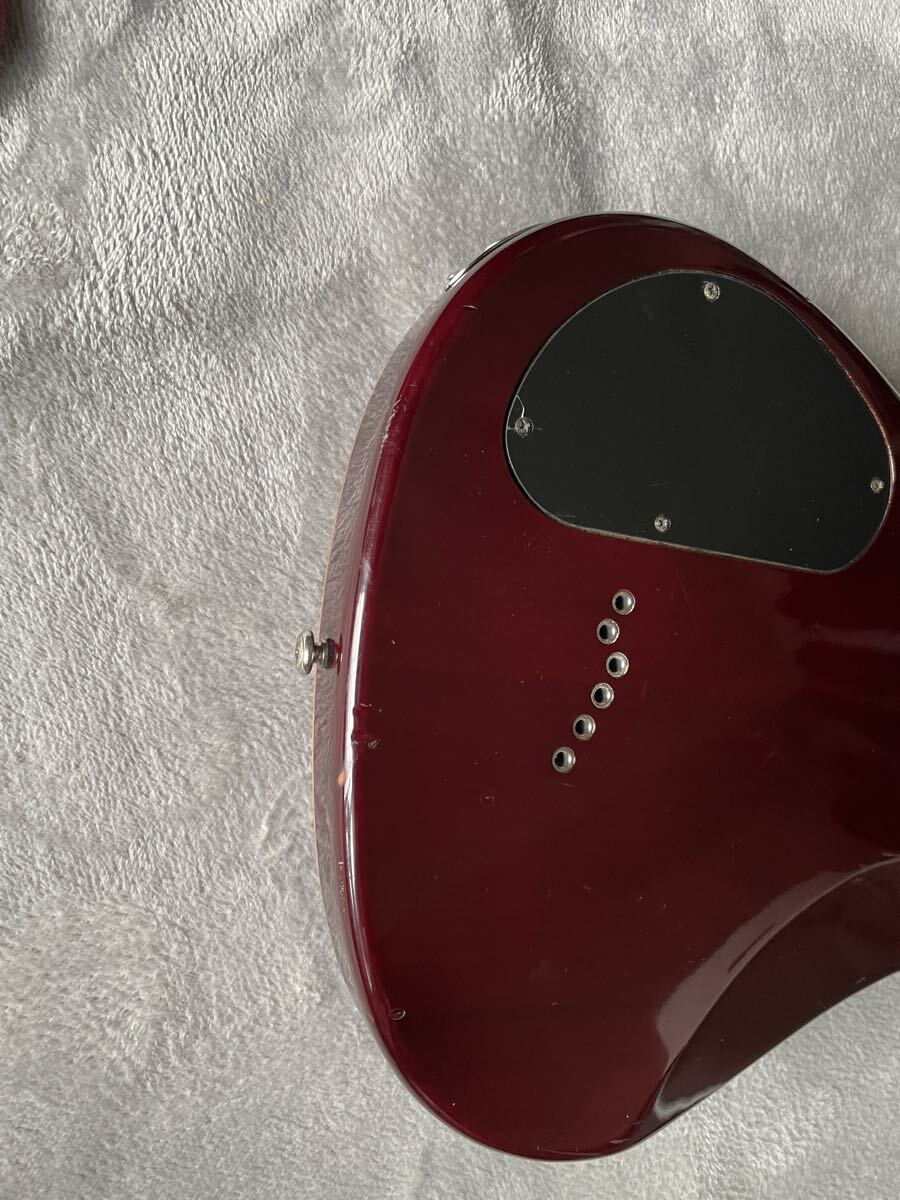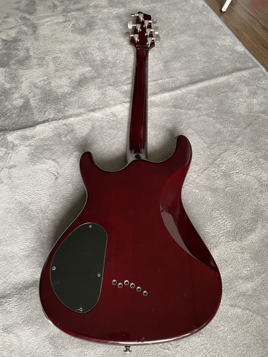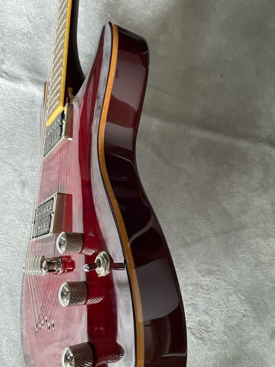 マホガニー×メープルのボディ、RGとは違う太めのネック…とレスポールを参照したスペックですが、ボリュートによる補強・PRSタイプのペグ配置・コンター付で取り回しの良いボディと課題点をクリアしたデザインです。