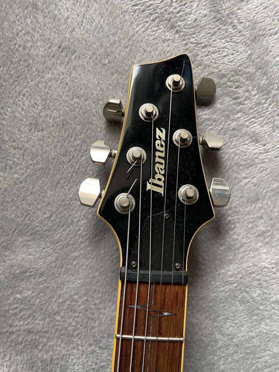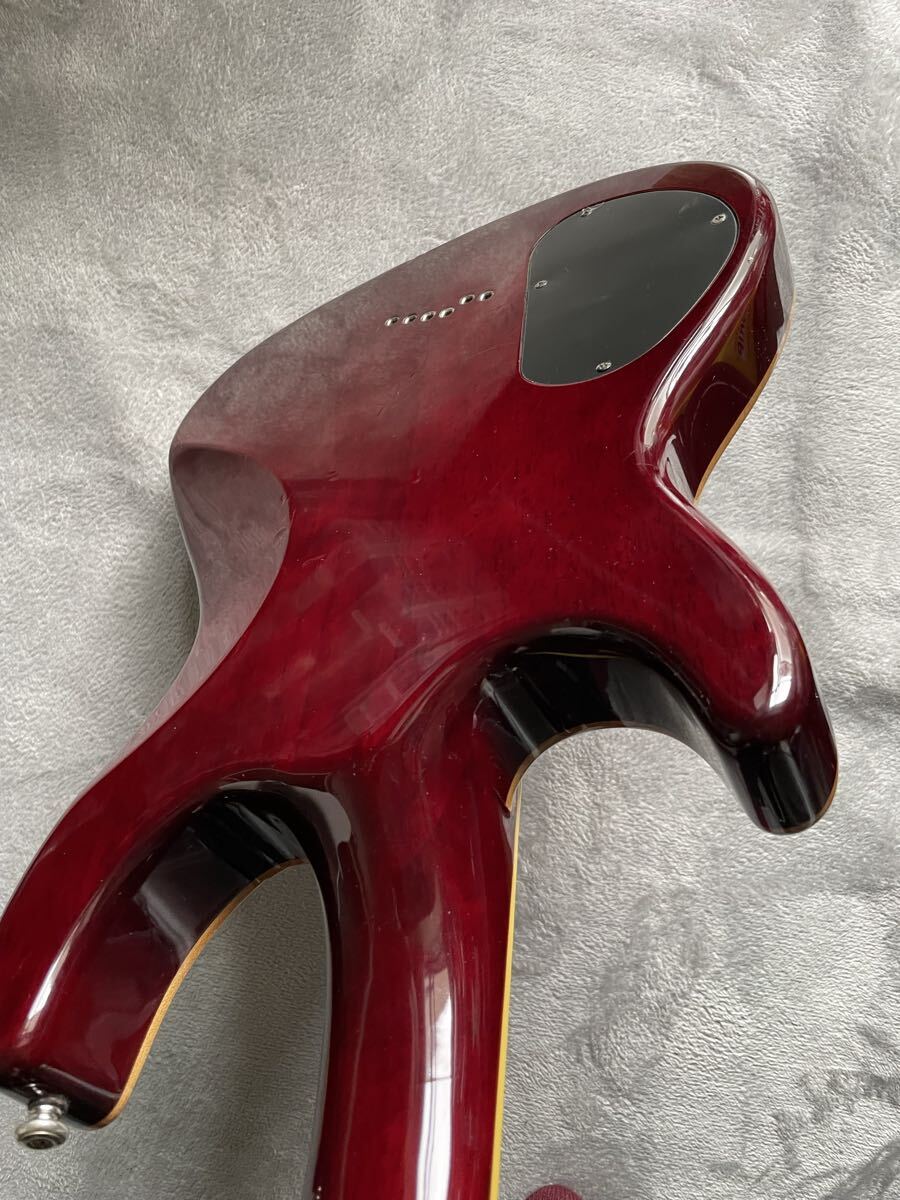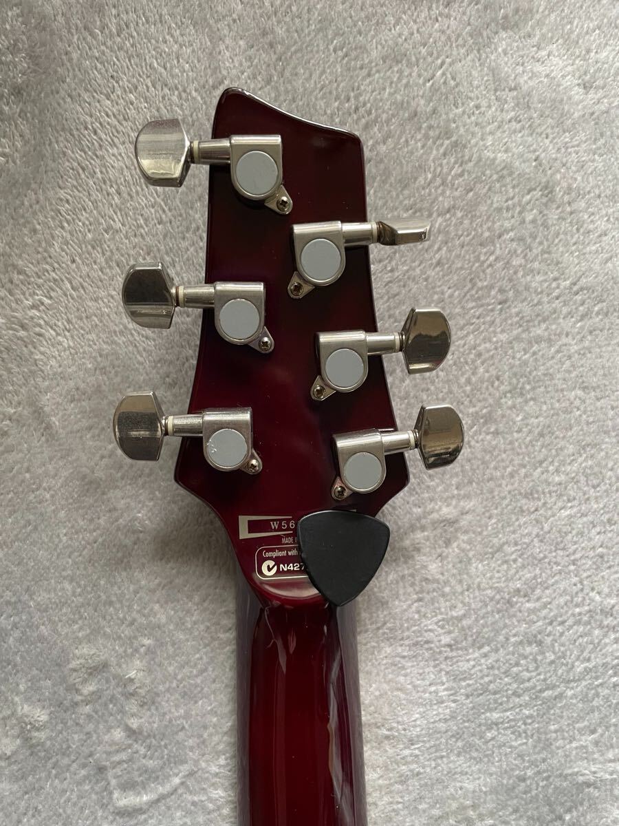 マホガニー×メープルのボディ、RGとは違う太めのネック…とレスポールを参照したスペックですが、ボリュートによる補強・PRSタイプのペグ配置・コンター付で取り回しの良いボディと課題点をクリアしたデザインです。