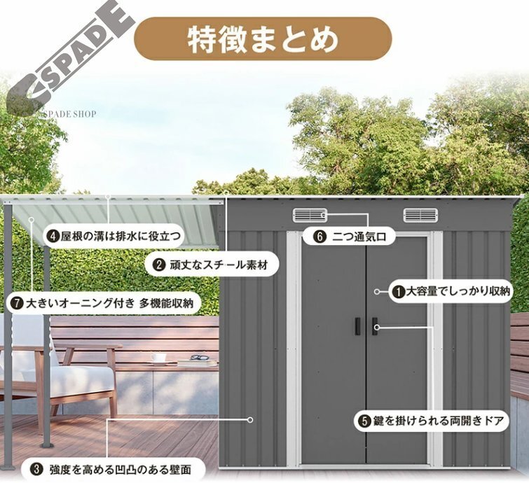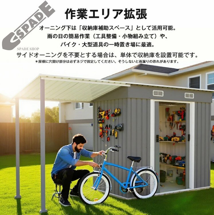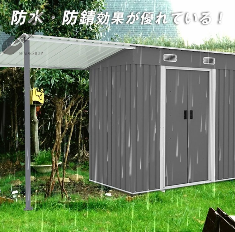 • 【屋根の溝は排水に役立つ】内部は濡れないために、斜面を設計しました。雨が降ると、屋根にたまることなく、斜面と凹槽を経由して地面に流れ落ちます。湿気から工具を守る頑丈で耐久性があり、変形しにくい、悪天候から内部の物品を保護します。
