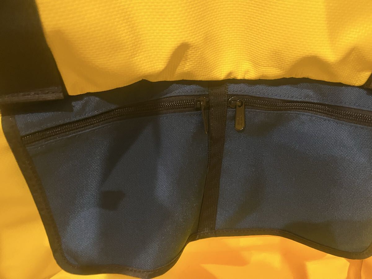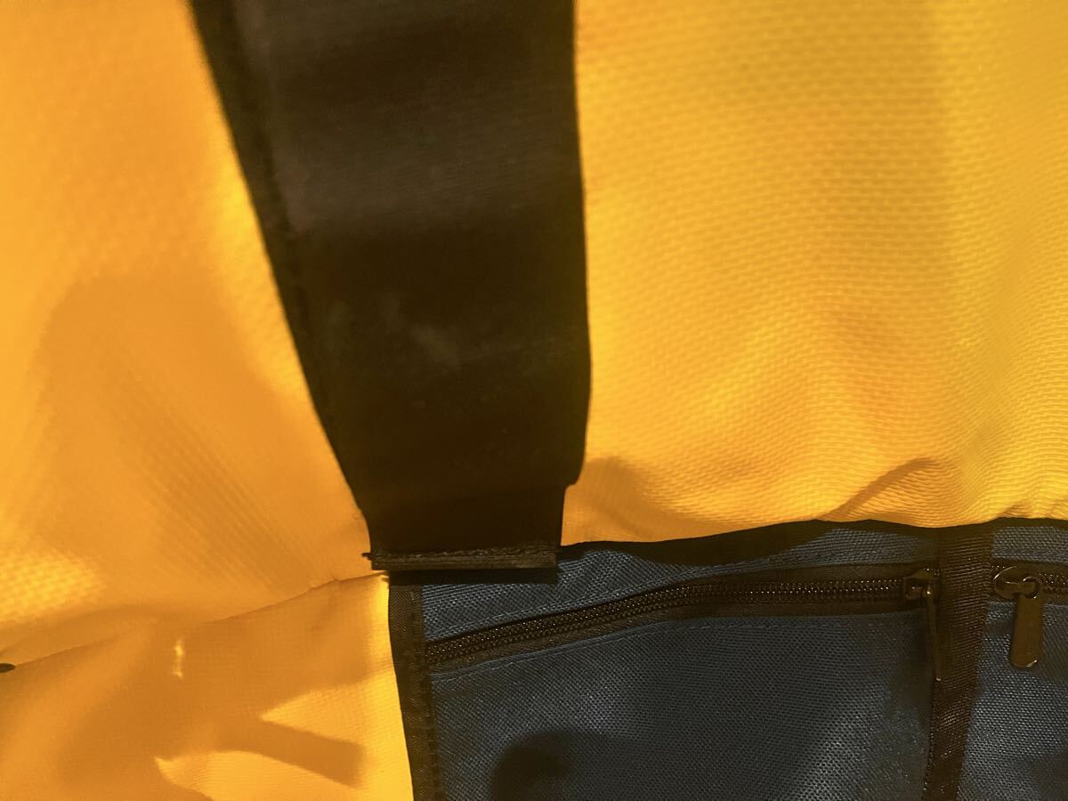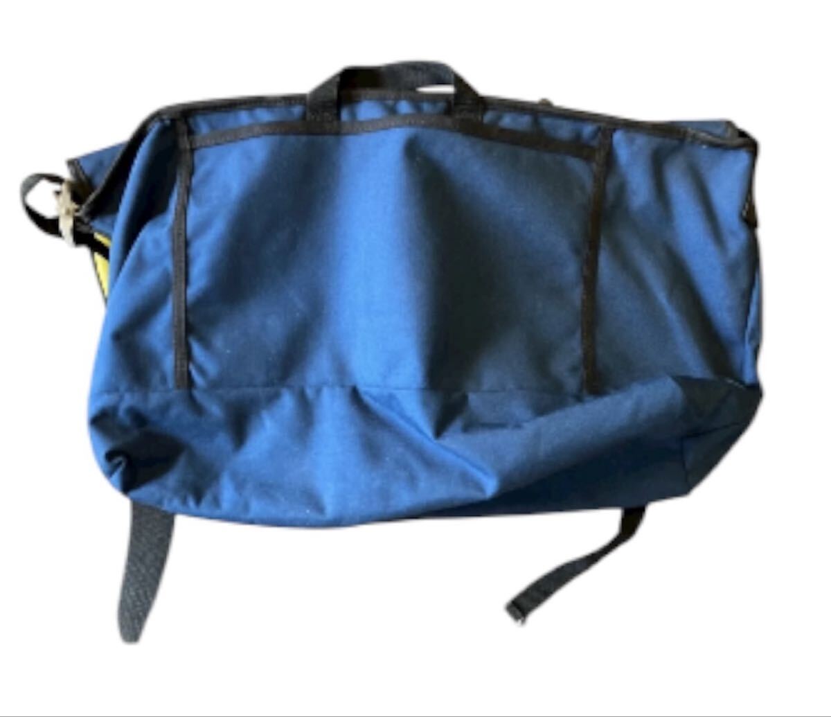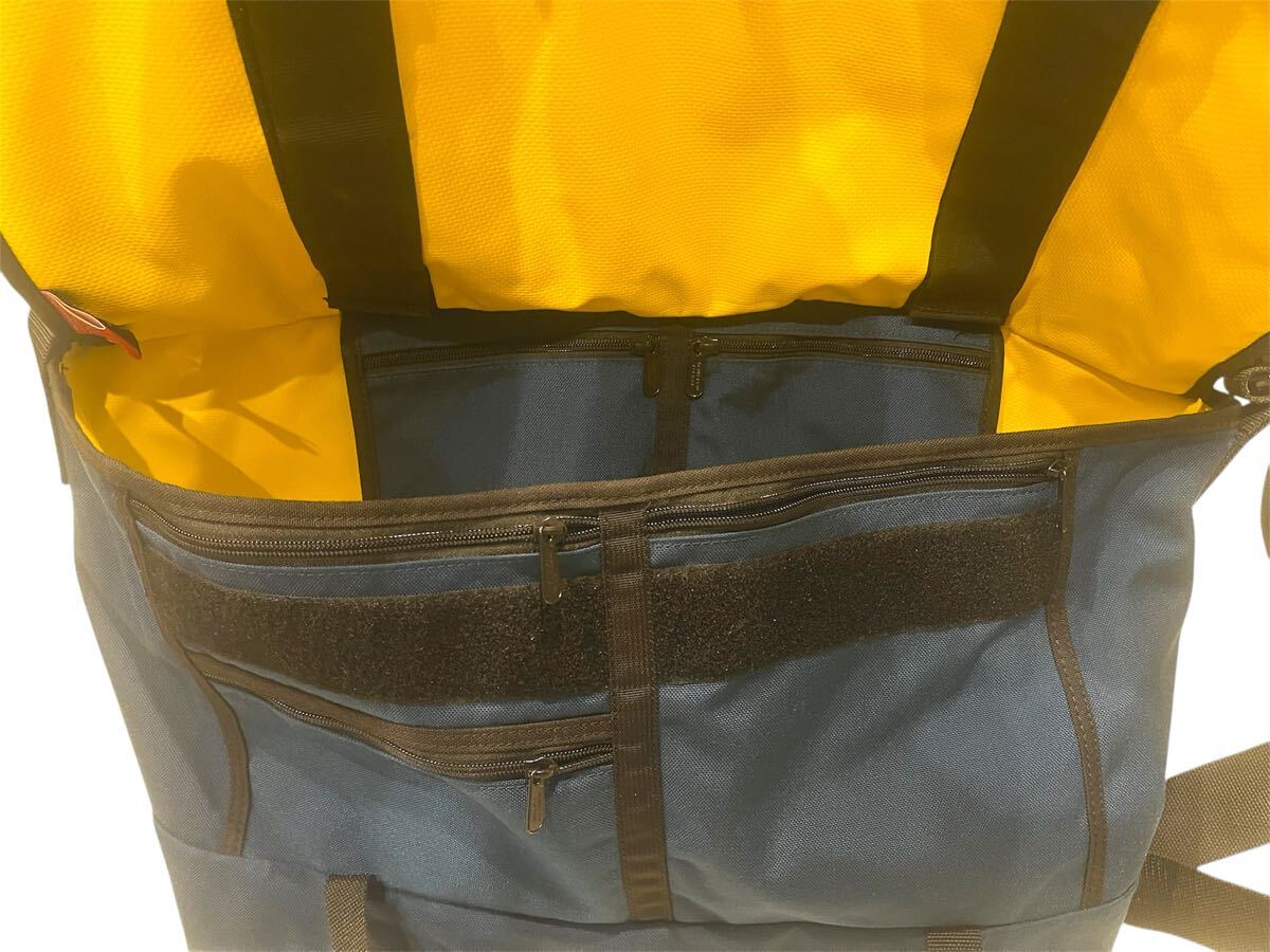 表にコーデュラナイロン、裏にウォータープルーフのビニールを合わせた、丈夫で耐久性に優れたメッセンジャーバッグ。大きめのフォルムながら、内外に計6つのポケット
