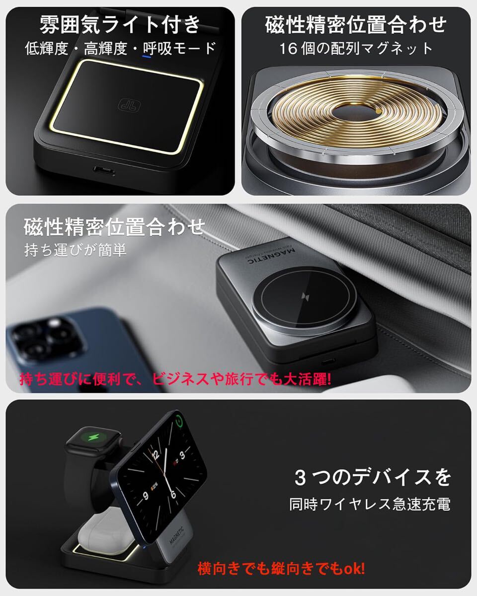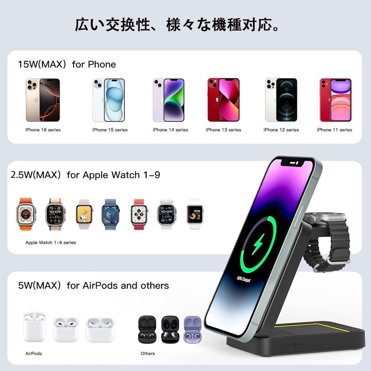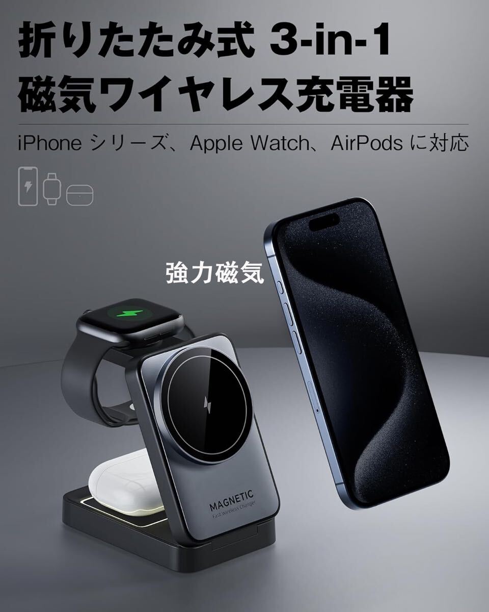 Magsafe対応 15W急速 折り畳み式 マグネット 3in1 ワイヤレス充電器 マグネット式 3-in-1 iphone16~12/ Airpods/アップルウォッチ ワイヤレス出力15W/5W/2.5W