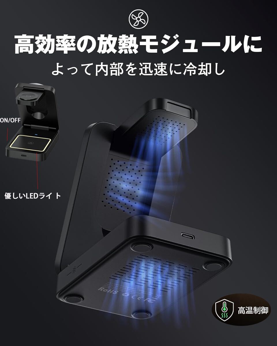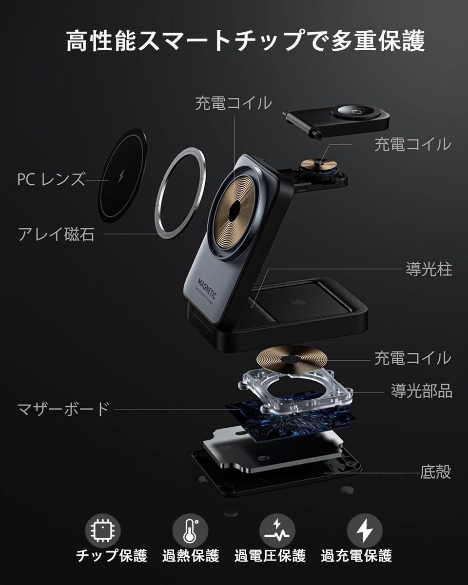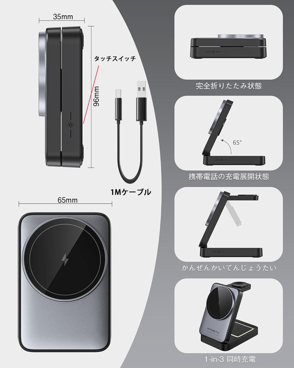 Magsafe対応 15W急速 折り畳み式 マグネット 3in1 ワイヤレス充電器 マグネット式 3-in-1 iphone16~12/ Airpods/アップルウォッチ ワイヤレス出力15W/5W/2.5W