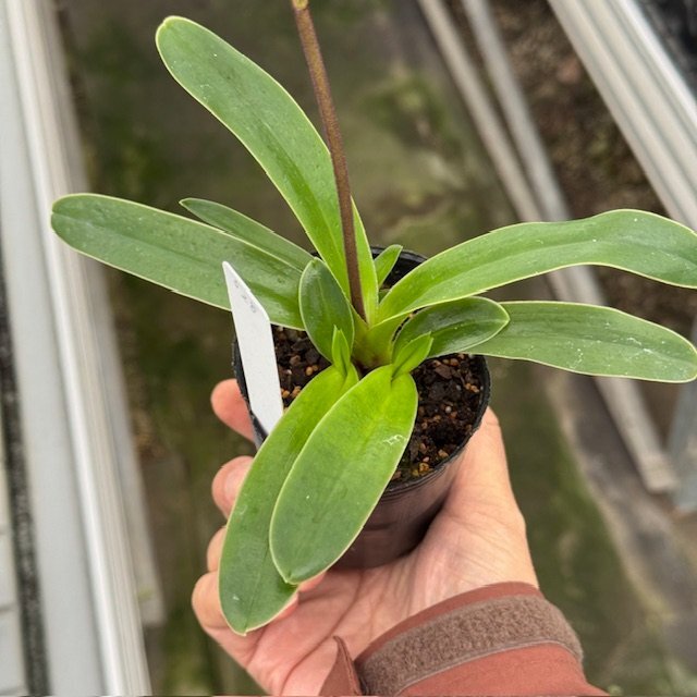 親の解説当方の当たり交配’Warden’sPunk’AM/AOSבFantastico’の中で最も形の良いセレクト個体‘Tramont’にお客様から頂いた巨大輪の個体の花粉を交配したものです。‘Tramont’は初花時ではドーサルが良いだけの花に思えましたが、2回目の開花で作上がりしてペタル幅が28mmにもなりました。NS80mmも無い花で28mmはバランスとしてかなり太く見えます。その花を母体にNS100mmPW30mmの花粉を付けました。