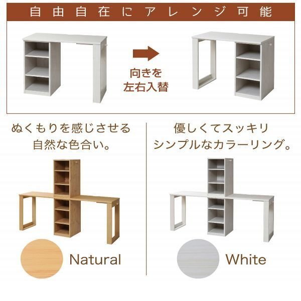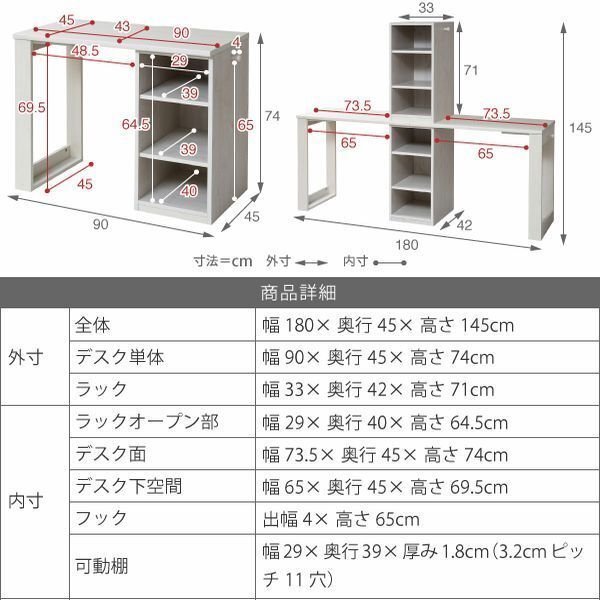 | 【カラー】 ナチュラル、ホワイト 【サイズ】 <外寸> 全体:幅180×奥行45×高さ145cm デスク単体:幅90×奥行45×高さ74cm ラック:幅33×奥行42×高さ71cm <内寸> ラックオープン部:幅29×奥行40×高さ64.5cm デスク面:幅73.5×奥行45×高さ74cm デスク下空間:幅65×奥行45×高さ69.5cm フック:出幅4×高さ65cm 可動棚:幅29×奥行39×厚み1.8cm(3.2cmピッチ11穴) 【材質】 本体:プリント紙化粧合板 天板:合成樹脂化粧合板(PVC) 【耐荷重】 デスク面:30kg以下 可動棚:8kg以下 【生産国】 中国 【梱包】2梱包でお届けします。 2-1 サイズ:96×49×13cm、重量:19.3kg 2-2 サイズ:96×49×13cm、重量:19.3kg 【その他】 ・可動棚:4枚 ・フック:4個 ・背面化粧有り 【組み立て品】 お客様による組み立てが必要です。 【ご注意】 ・サイズ、重量は概算です。 ・商品カラーはご使用のモニターによって実際の明るさや色と異なって見える場合がございます。 |