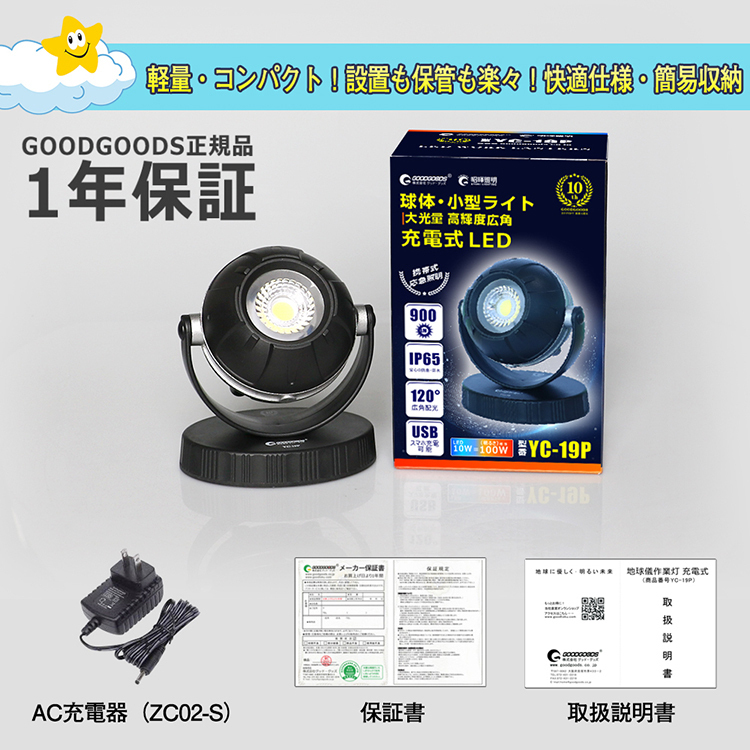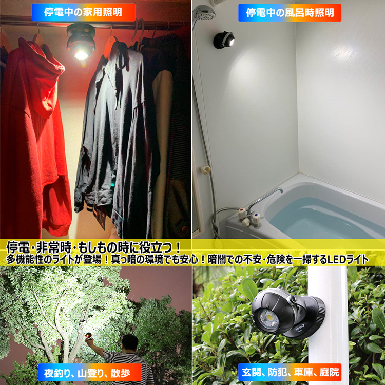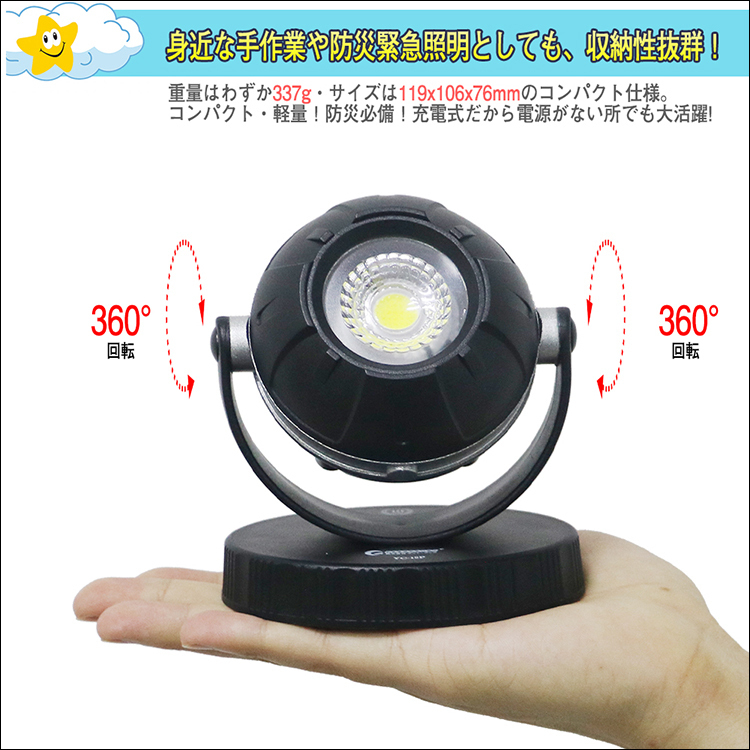| ★オススメポイント★ ●画期的なバージョンアップ!最新小型ライト! ●コンパクト・軽量!防災必備! 重量はわずか337g・サイズは119x106x76mmのコンパクト仕様。 身近な手作業や防災緊急照明としても、収納性抜群! 充電式だから電源がない所でも大活躍。 ●360°照射角度調節可 ライト筐体LEDボールライト。360度回転で好きな方向へ照射可能! 円形台座採用、安定性抜群。 ●N45マグネット*4個付き 台座の底面に磁石4個を搭載。鉄面などにしっかり吸着可能 バッテリー残量指示ランプ付き! バッテリー残量のLEDインジケーター付き。蓄電量・充電残量が一目で分かる! ●USB出力口付き! 5V 1AのUSB出力口つき。スマホなどに充電可能!緊急バッテリーとしても活躍します。 ●点灯3モードく 常時点灯はもちろん、居場所を知らせるモールス信号の「SOSモード付」で安心。 万が一にも心強い安心機能。 ●IP65防塵防水規格 ●用途 身近な手作業、倉庫作業、バイクや車のメンテナンス、水道やガス等の設備メンテナンス、夜釣り、登山、キャンプ、アウトドア等のシーンで活躍! |