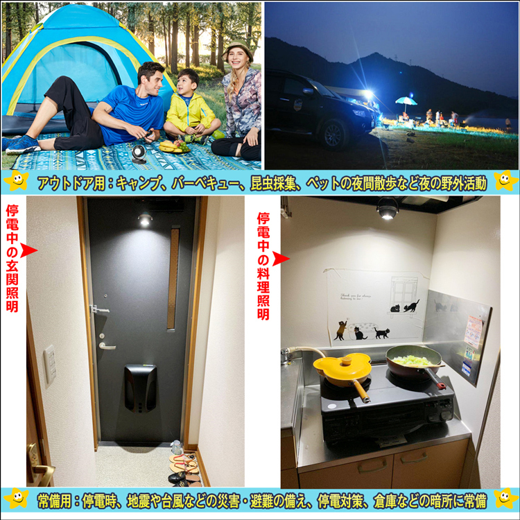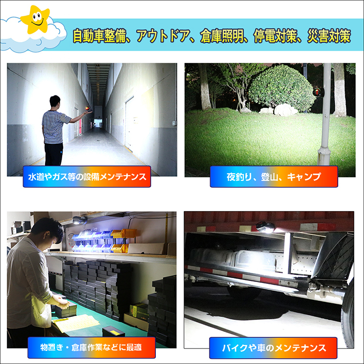 | 明るさ | 900LM | 充電指示ランプ | 充電中:赤ランプ点滅 充電完了:緑ランプ点灯 |