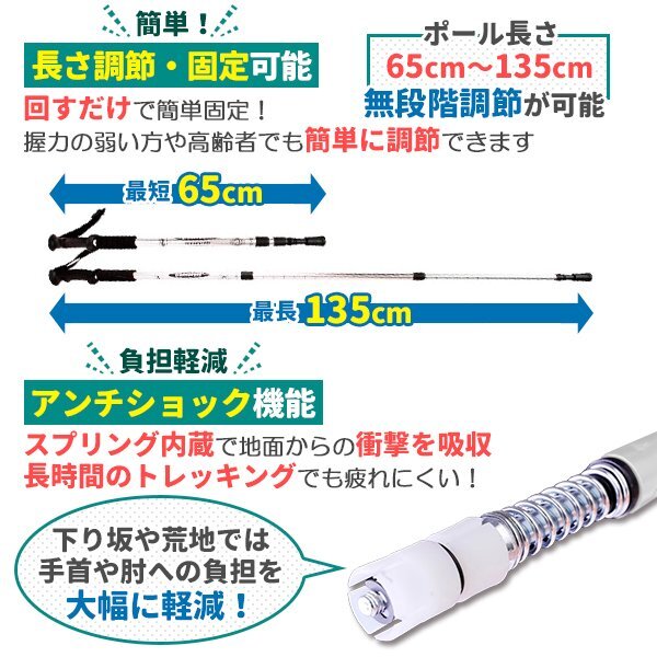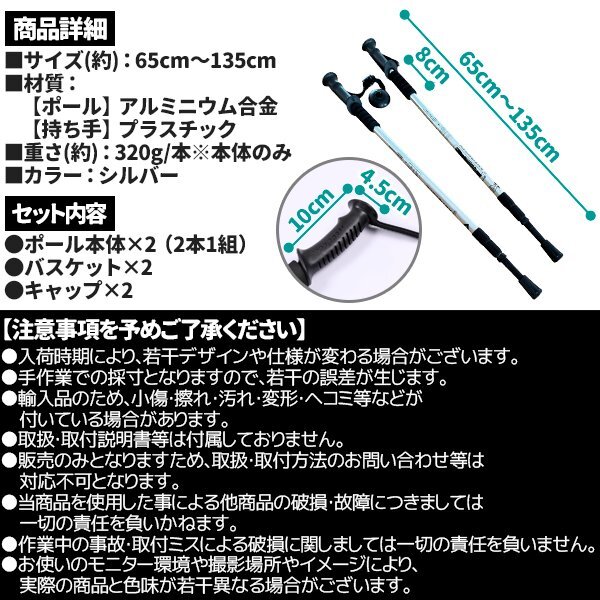 送料無料トレッキングポール 2本 アルミ製 アンチショック機能付 ステッキ 杖 スティック トレッキング ウォーキング ノルディック 登山 銀
