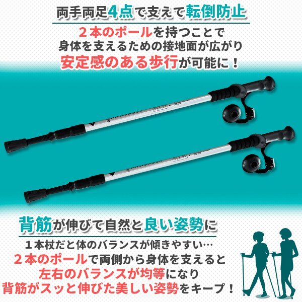 2本杖で両側から身体を支えると、左右のバランスが均等になり、正しい姿勢が矯正され、