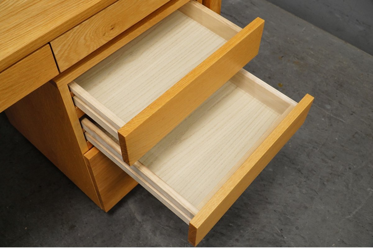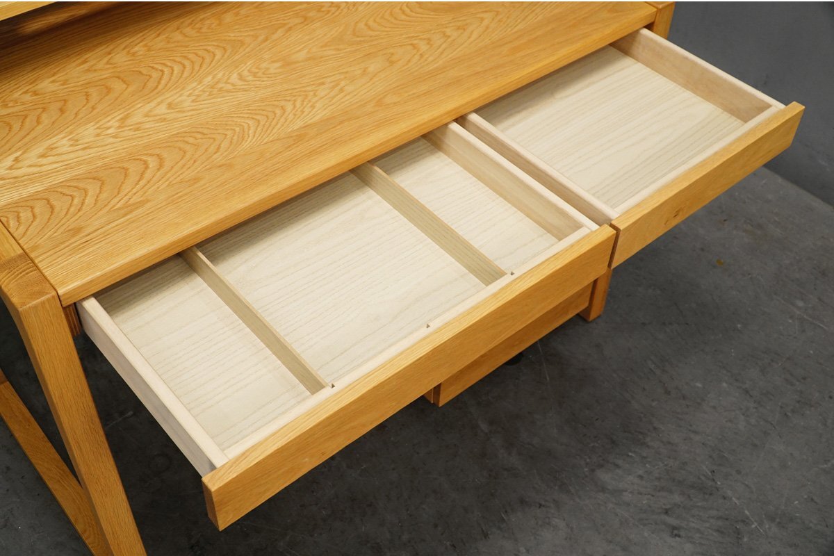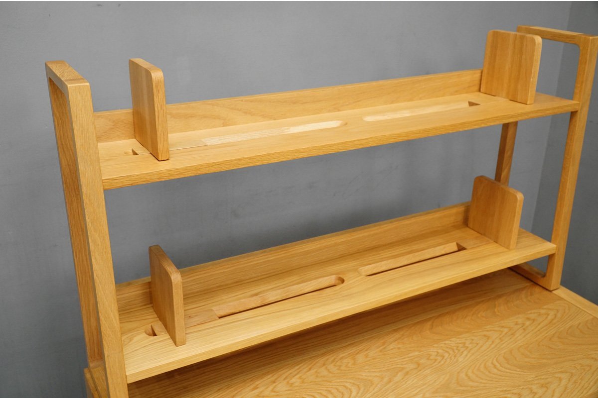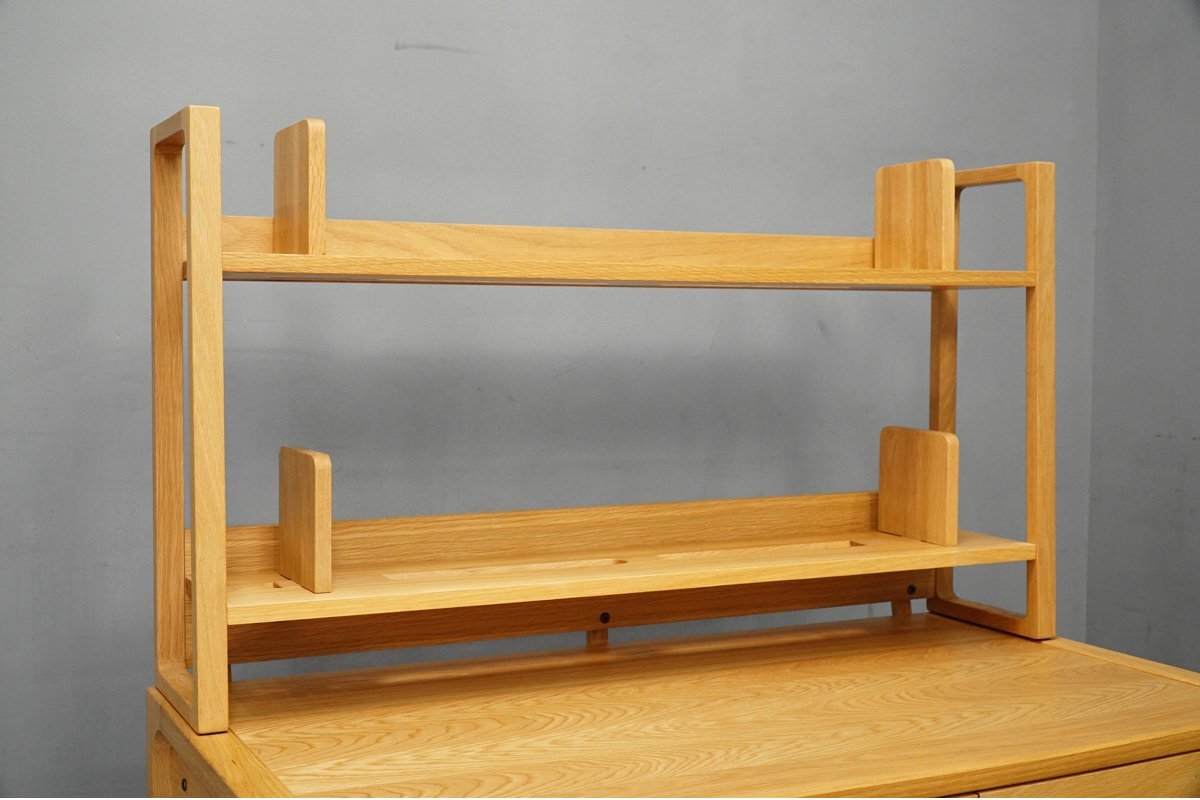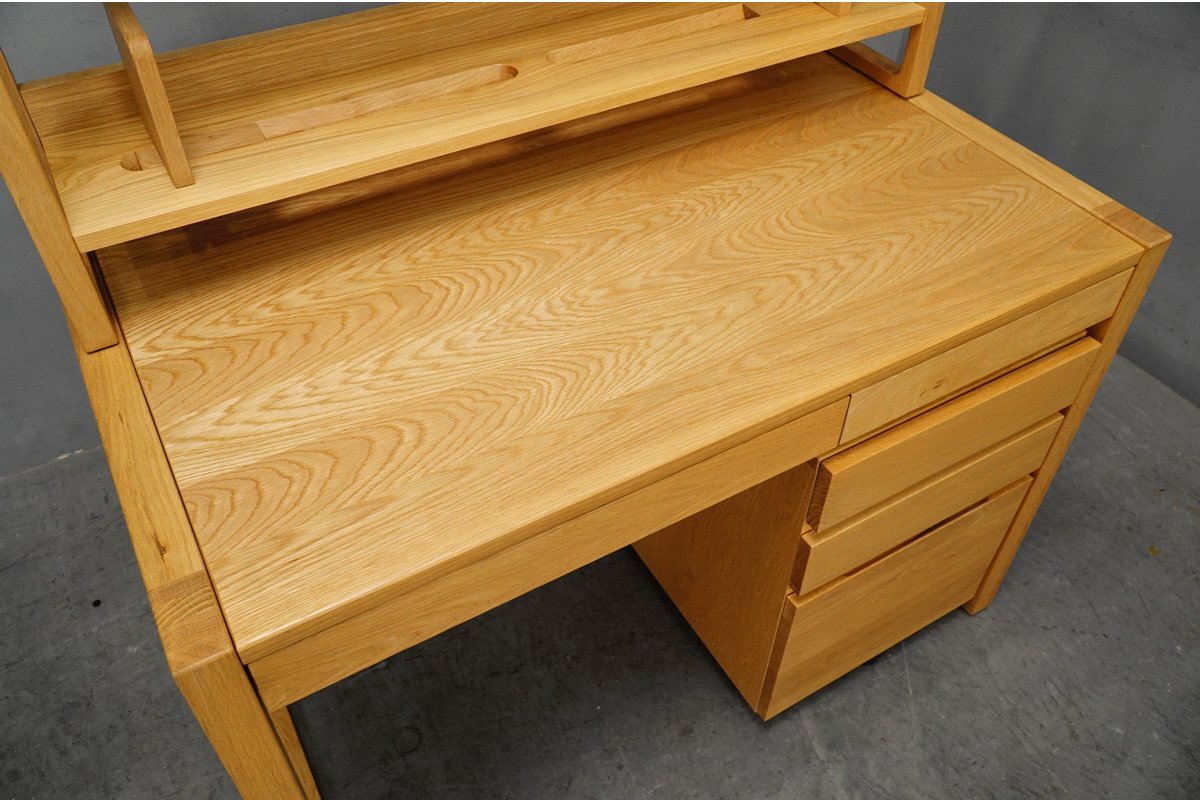 ◇ACTUS(アクタス)のFOPPISH2 (フォピッシュ2) デスク ハイタイプセットです。 ロングライフデザインをコンセプトに作られたフォピッシュシリーズは「質実剛健」。 しかも、大人が使うことを想定した、細部へのこだわりが詰まっています。天板の広さはアクタスのデスクの中では最大、引き出し5杯も最多。天板の左右幅いっぱいにデスクシェルフが付けられるので、大きさ、収納量ともにNo.1のデスクです。子どもから大人まで、あらゆる世代の人に使っていただける無駄のないデザインが特徴の無垢のオーク材を使った本格的な大人仕様の家具です。 チェアはアクタスのT-KIDS チェア。 家具の産地として名高い岐阜県の飛騨高山の技術で作られたT-KIDS(ティーキッズ)チェア。 座面の高さ・奥行き・足置きの位置が調整できるオリジナルデスクチェアです。 椅子に腰掛けると体重でストッパーがONになる動きを抑制し、お勉強に集中しやすくなる前傾姿勢が保てます。 日本製の丁寧な作りが随所に生きています。 参考新品価格(約):187,000円(デスクセット/135,300円+チェア/51,700円) |