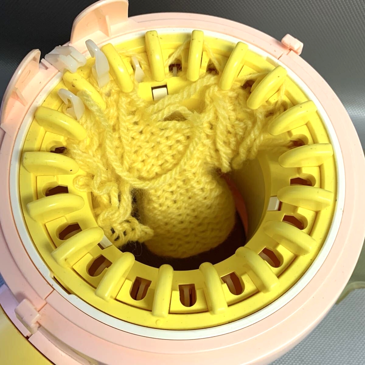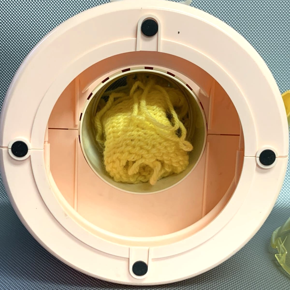 毛糸をセットしハンドルを回すと、簡単にニットが編めます。