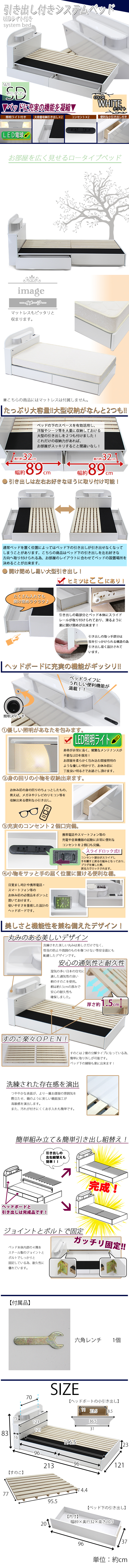 | 商品名 | 引き出し付きシステムベッド ベッドフレーム ライト付き セミダブル ホワイト 白 ロータイプベッド システムベッド 低床ベッド すのこベッド すのこ ベッド フレーム 木製 引き出し 照明 LED コンセント付き 収納 収納ベッド マルチ 多機能 桐 lis03sdwh |