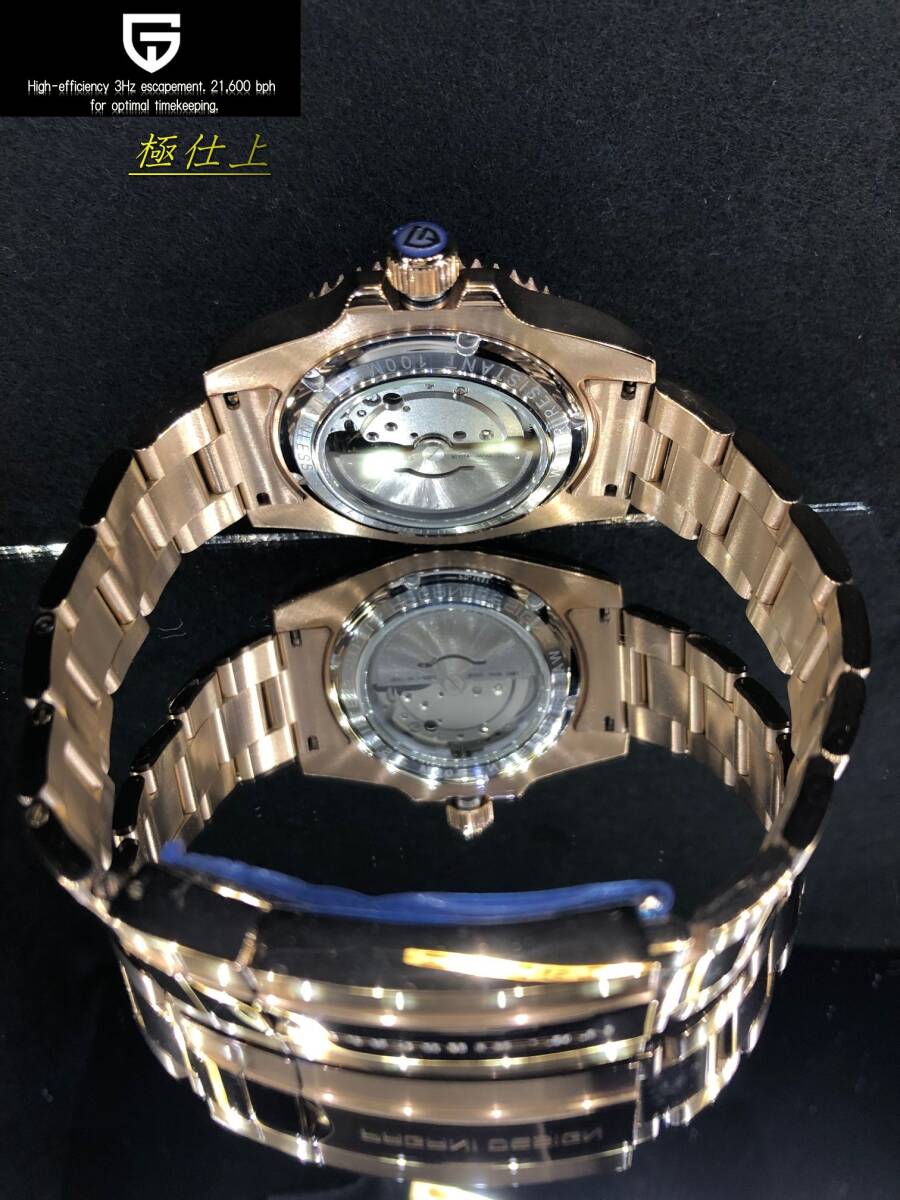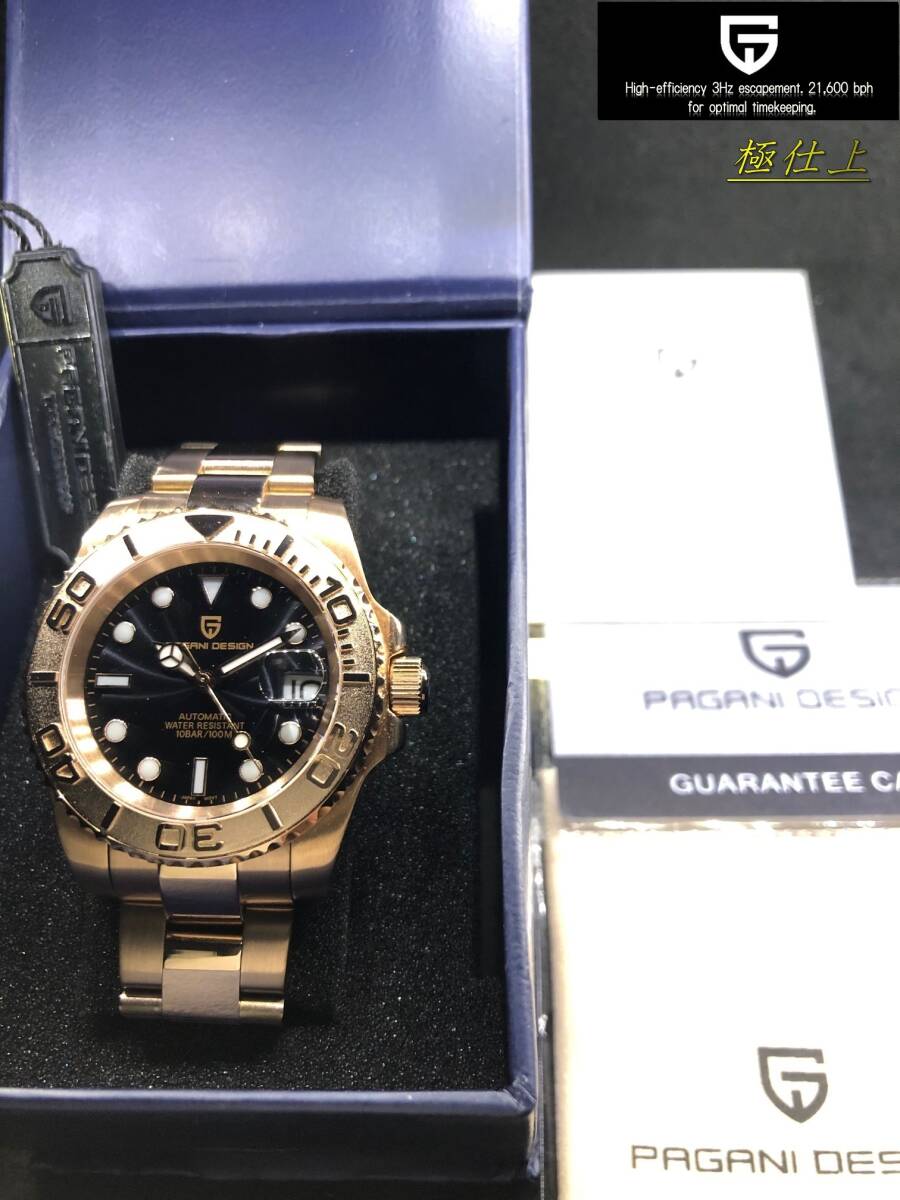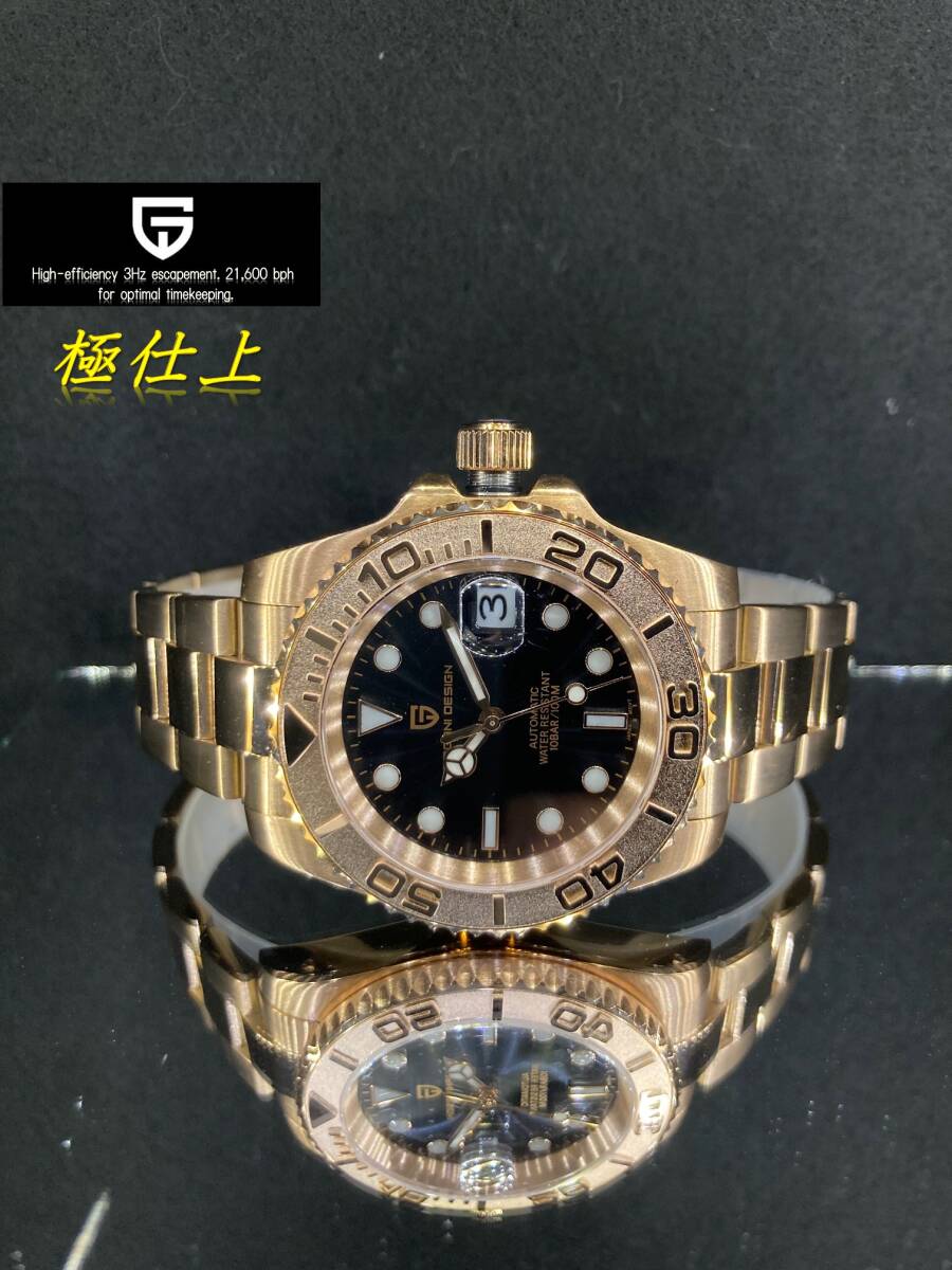 ■フルゴールドのヨットマスターオマージュモデルです。赤みを帯びたローズゴールドは周囲から貴賓にしか映らないでしょう。本家も同色がありますが、見劣りしません。さすがPagani Designと記載のメーカー。極仕上げ品のため高級時計で感じられる「しっとり感」がございます。是非ご堪能下さい。