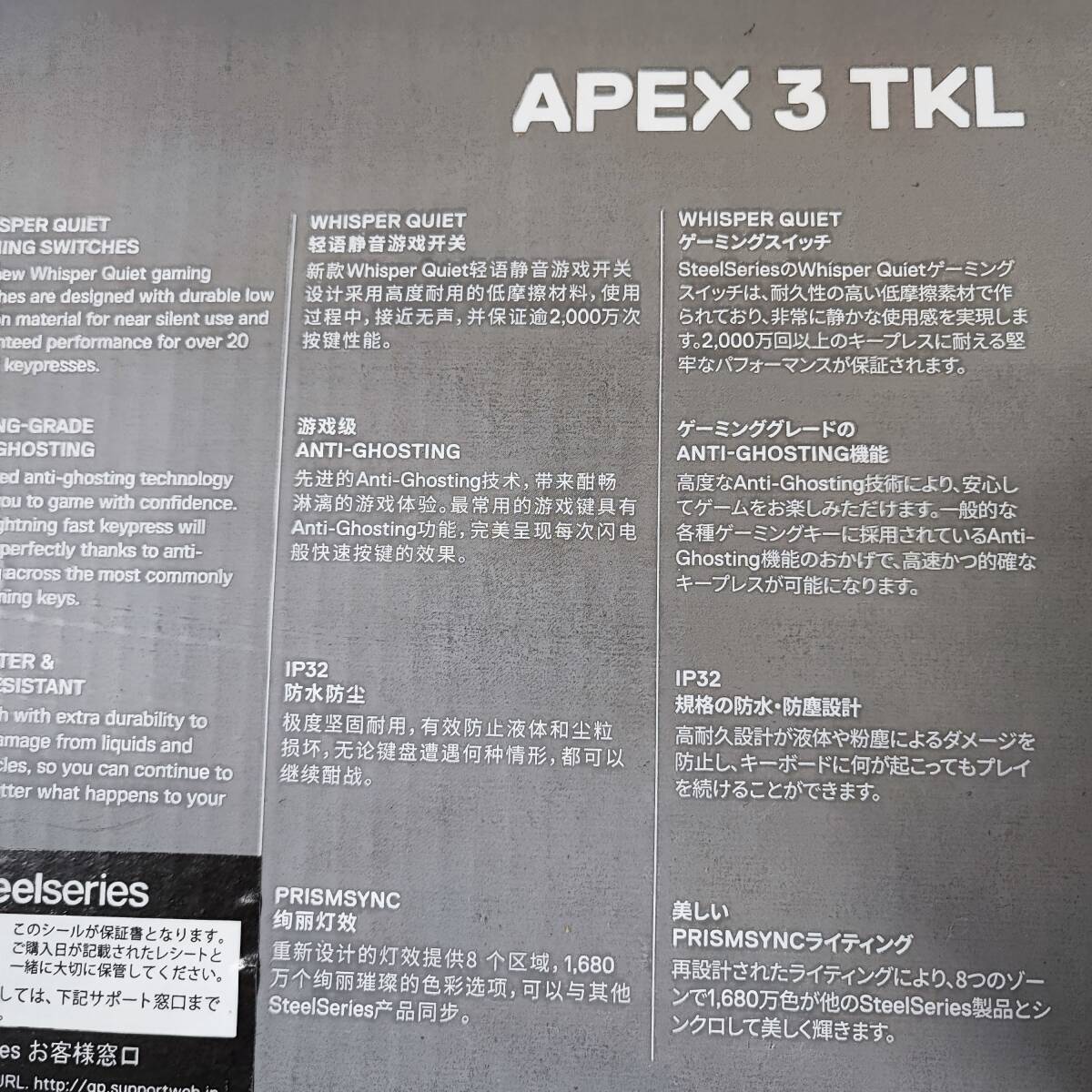 | ※必ず最後までお読みください。 Please be sure to read to the end. 一定要到最后※ | 商品概要 | 数あるオークションの中からこちらの商品をご覧頂きまして誠にありがとうございます! ※商品説明と注意事項を必ず全てお読み頂いた後にご入札下さい※ 引き続き 安心できる気持ちの良いお取引を心掛けてまいりますのでどうぞ 宜しくお願い致します! 色んなジャンルの商品を多数出品しておりますので、こちらをクリックしてご覧ください!! 東京都公安委員会 古物商許可 第307781505147号 ◎未使用/保管品◎steelseries APEX 3 TKL RGB照明付き防水静音テンキーレスキーボード ゲーミング 即発送 ※最下部にも写真掲載中なので必ずご覧下さい。 【商品概要】 アンチゴースト機能搭載キー、メカニカルキーボードのような60gの押し込み力、2000万回のキーストロークに耐える「Whisper Quiet Switches」で完璧なパフォーマンスを体験できます。 eスポーツプロが好むTKLレイアウトはマウス操作のスペースを最大化し、あらゆるレベルのゲーマーに最適なキーボードです。 ・静音設計のゲーミングスイッチは2000万回以上のキーストロークに耐えます ・ゲームやDiscordに反応するカスタマイズ可能な8ゾーンRGB照明 ・専用マルチメディアコントロールで音量とメディアの調整が簡単 ・IP32防水仕様で、液体の飛散から保護します 公式サイト⇒こちらをクリックしてご覧ください!! 【状 態】 写真をよくご確認お願い致します。外装ランク:(N) 【詳細・備考】 写真に写っているものが全てになります。 また、タイトルや本文と写真が異なる場合は写真を正とします。 保管品なので状態判断には個人差があることを予めご了承の上 写真にてご確認ご判断をお願い致します。 譲り受けたお品で当方は専門店ではないので詳細の質問にはお答えできかねます。 また簡単な検品は行っていますが、譲り受けた商品のため欠品等見落としがある場合がございますので保証等はしかねます。 ※返品不可が入札条件となります。 ※中古現状とは動作未確認のジャンク品になります。 ※通電確認とは電源に繋げてONOFFの確認のみになります。 ※バッテリーや電池は消耗品なので経年劣化がある場合もあることをご了承お願い致します。 ※保管品に関しては未使用でも新品ではございませんので、保管期間による劣化等ある場合もございますので、新品をお求めの方はご入札をお控えください。 ※ジャンク品ではなくても中古品の性質上、配送途中や到着後に万が一不備不良が起きうる場合もございますがも保証はできかねますので、返金返品不可をご了承の上ご入札お願い致します。 ※未開封品に関しては中の状態が不明な為、不具合等ございましたらメーカーとご相談お願い致します。保証対象外とさせて頂きますのでこちらでは対応いたしません。 尚、実際の色とパソコンや携帯の画面を通じた色彩は異なる場合もございますのでお気をつけ下さい。 =外観ランク表記= (N)長期保管/未使用品(新品ではございません) (S)数回程度使用の美品 (A)多少の傷、若干の使用感がありますが程度良好の美品 (B)一般的な使用感あります。 (C)汚れ、使用感を感じるがまだまだ使える品物 (D)汚れ、使用感等が見受けられる難有品 (E)ジャンク品 ※大体の目安としてお考え下さい。 新品に近いものをご希望の方や神経質な方のご入札はご遠慮下さい。 ご入札頂いた時点で本文説明文に了承を頂き、商品にご納得して頂いたと当方で判断させて頂きますので 【ノークレーム・ノーリターンがご入札の条件となります】 また、弊社のオークションでは いろんなジャンルで多数出品しておりますので是非ご覧ください(^_-)-〇 ![]() ▶入札の取り消しは受け付けておりません。 落札後の質問やキャンセルも受け付けておりません。 尚、営業時間が9-18時となっておりますのでオークション終了間際や質問内容によっては返答できない場合がございます。 ジャンク商品に関してはいかなる場合も返品返金の対応はできかねます。 落札後のサイズ違いやイメージ違い等のキャンセル、クレーム、返品等はお受けできませんので予めご了承ください。 ご入札の方につきまして、当方にて評価が著しく悪いと判断した場合は、トラブル防止の観点からご入札を取り消させていただく場合がございますので予めご了承ください。 新規IDの方や、いたずら入札と判断した場合、入札削除させていただく場合がございますので、新規の方は質問欄にて購入意思を示してからのご入札をお願い致します。 ※ヤフオクの障害等で入札が不適切に成立した場合は落札された場合でも削除対象になりますことを予めご了承お願い致します。 取り置きは可能ですが物や金額によってはすぐに決済をお願いする場合がございます。 当方大量の商品を管理している為、複数落札の同梱ご希望の方は、「まとめて取引」の依頼を必ず行ってください。 ◆連絡方法◆ ▶当方連絡事項は全て取引ナビを使用しております。 ご連絡先、ご要