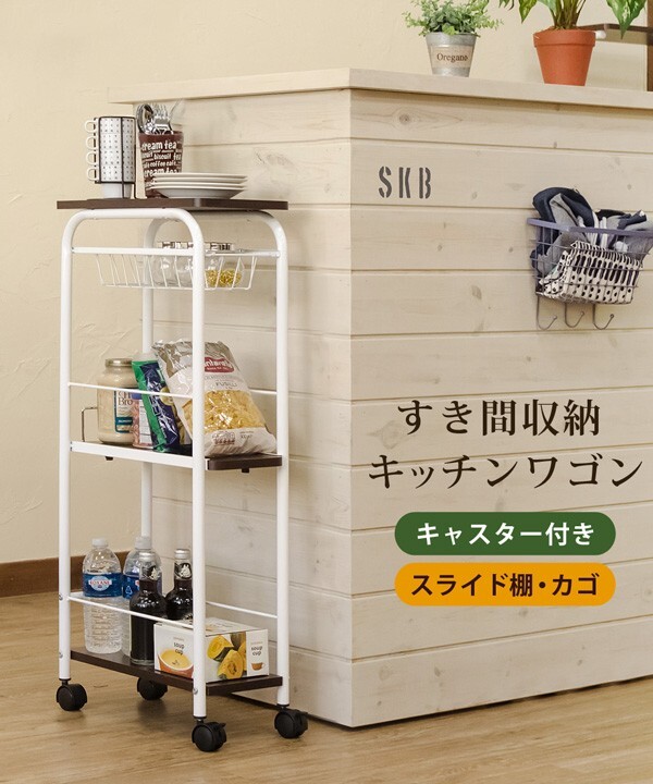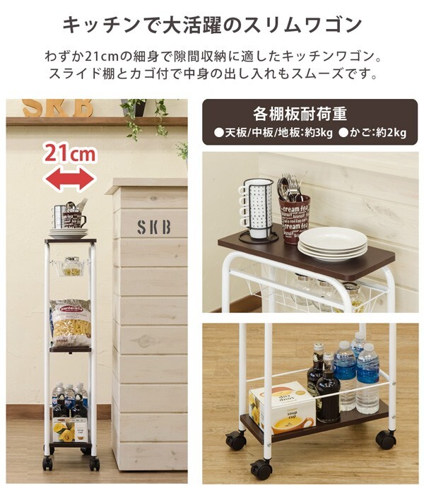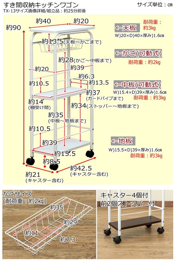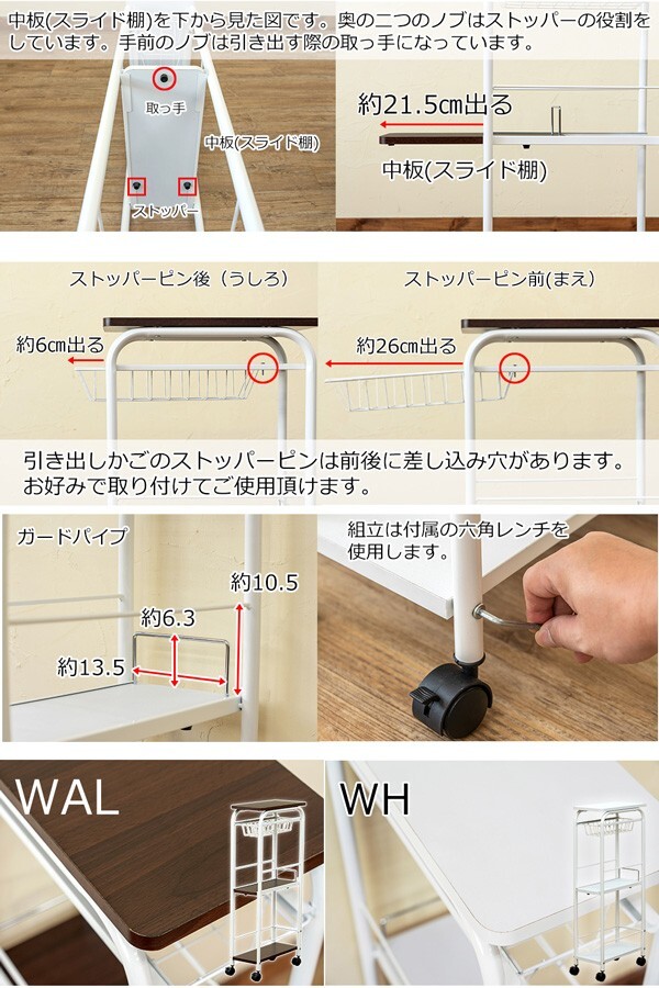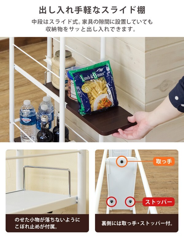 | サイズ | (W)幅21×(D)奥行き42.5×(H)高さ90cm 天板サイズ:W20xD40x厚さ1.6cm 中板(スライド棚)サイズ:W15.4xD39x厚さ1.6cm 地板(固定板)サイズ:W15.5xD39x厚さ1.6cm |
