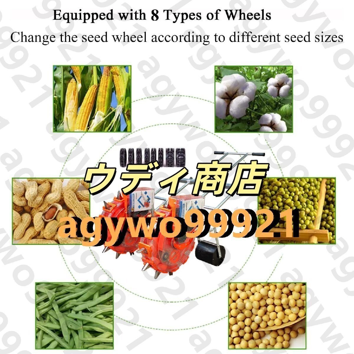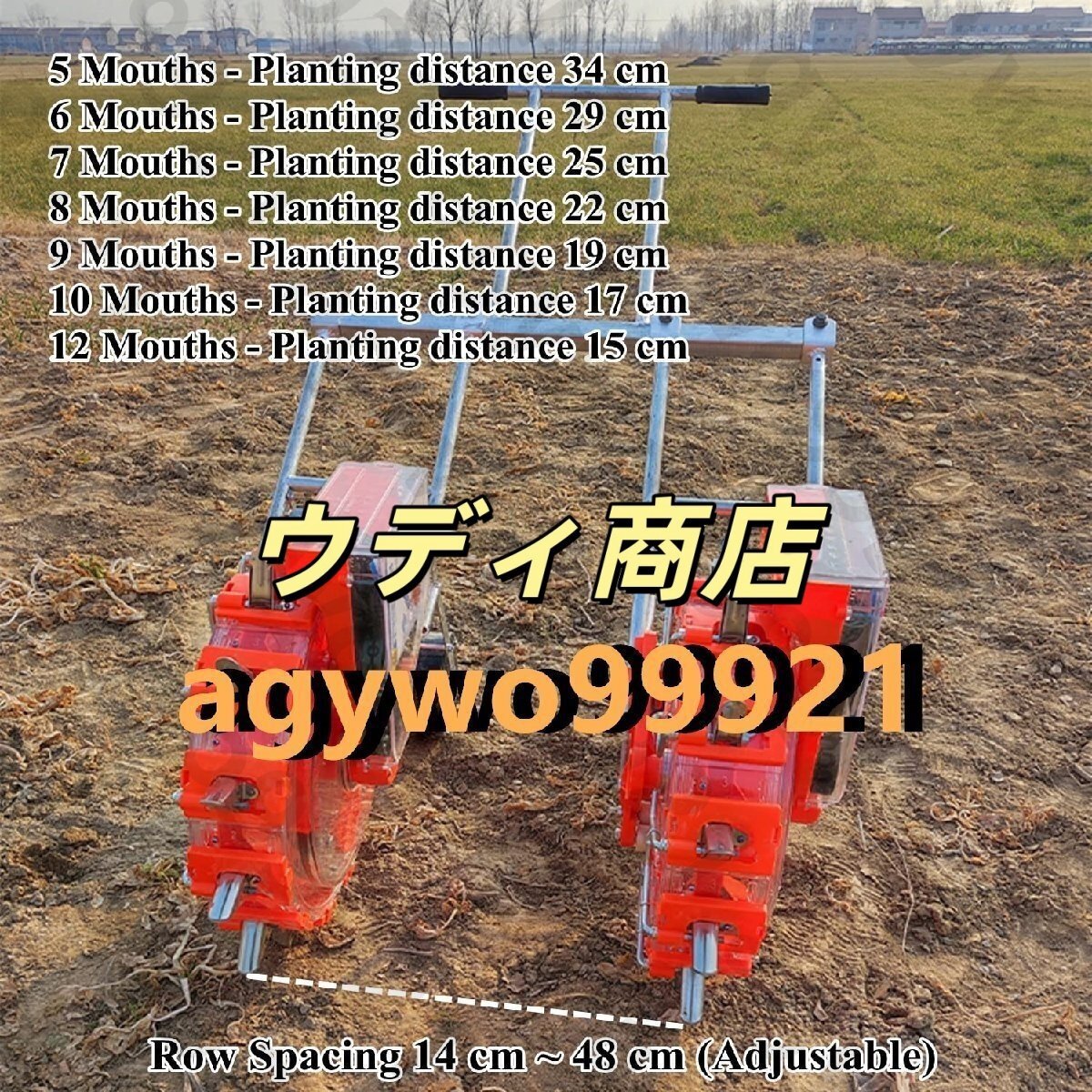ハンドプッシュ多機能シーダーは、小さな農地や家庭菜園に適した農具で、さまざまな作物の播種をすばやく便利に行うことができます。手動式多機能シーダーは、簡単で使いやすく、電気や燃料を必要としない、環境に優しく経済的な農業用具です。 小麦、トウモロコシ、大豆、野菜、その他の作物の植え付けに適しており、植え付け効率を大幅に向上させることができます。 同時に、労働集約度を減らし、植え付けの品質と収量を改善することもできます。仕様:製品名: 手押しローラー播種および施肥機植える深さ:1~7cm重量:11kg5口 - 植え付け距離34cm6口 - 植え付け距離29cm7口 - 植え付け距離25cm8口 - 植え付け距離22cm9口 - 植え付け距離19cm10 口 - 植え付け距離 17 cm12 口 - 植え付け距離 15 cmパッケージ:1×ウォークビハインドロークロッププランター8 x 異なる種子設定ホイール