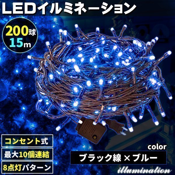 AC式 イルミネーション コンセント 連結可 LED イルミネーションライト ツリー ライト 200球 200灯 15m 黒線 ブルー
