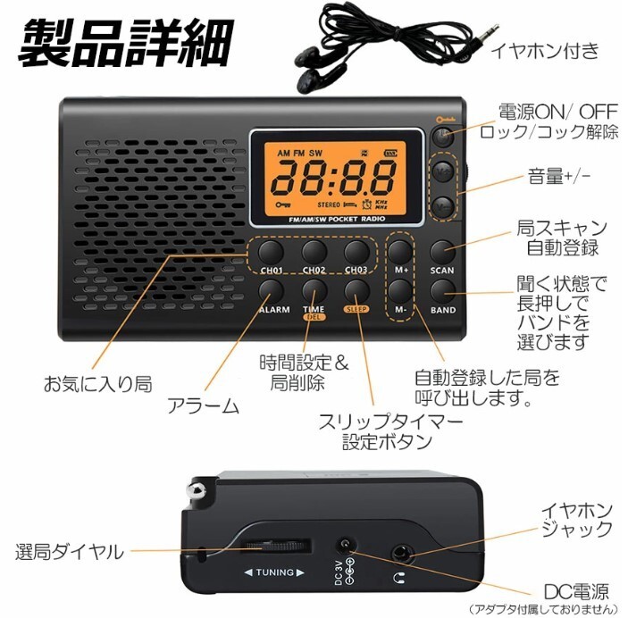 【ポケットラジオ】:本製品はプロフェッショナル航空DSPチップ採用、ノイズに邪魔されずスポーツやニュースを楽しむことができます。伸縮アンテナは、弱い信号領域でも最高の信号をもたらすことができます。