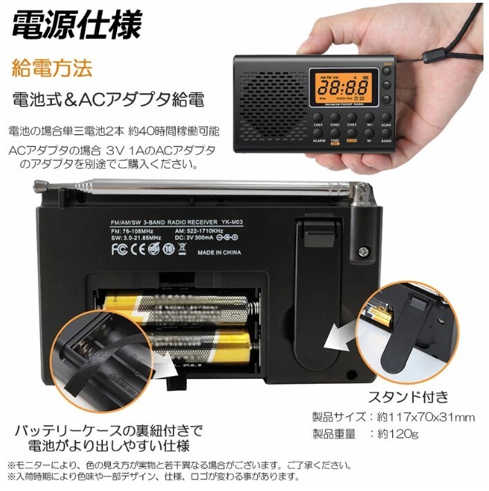 【小型ラジオ&電池式】本機はコンパクトでポッケトサイズで、持ち運びが便利です(幅117mm*奥31mm*高さ70mm)。単3型乾電池2本(別売)及び3V電源ソケットアダプタ(別売り)で給電可能です。ブランド電池で40H連続放送(中音量)可能です(乾電池は別売)。日常散歩、学習、災害の時でも適用します。