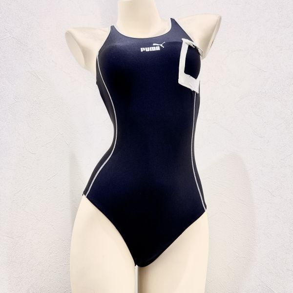 14プーマPUMA女子競泳水着160(Lサイズ程度)★微光沢ブラック黒ホワイト白パイピング★大きいサイズ男性も