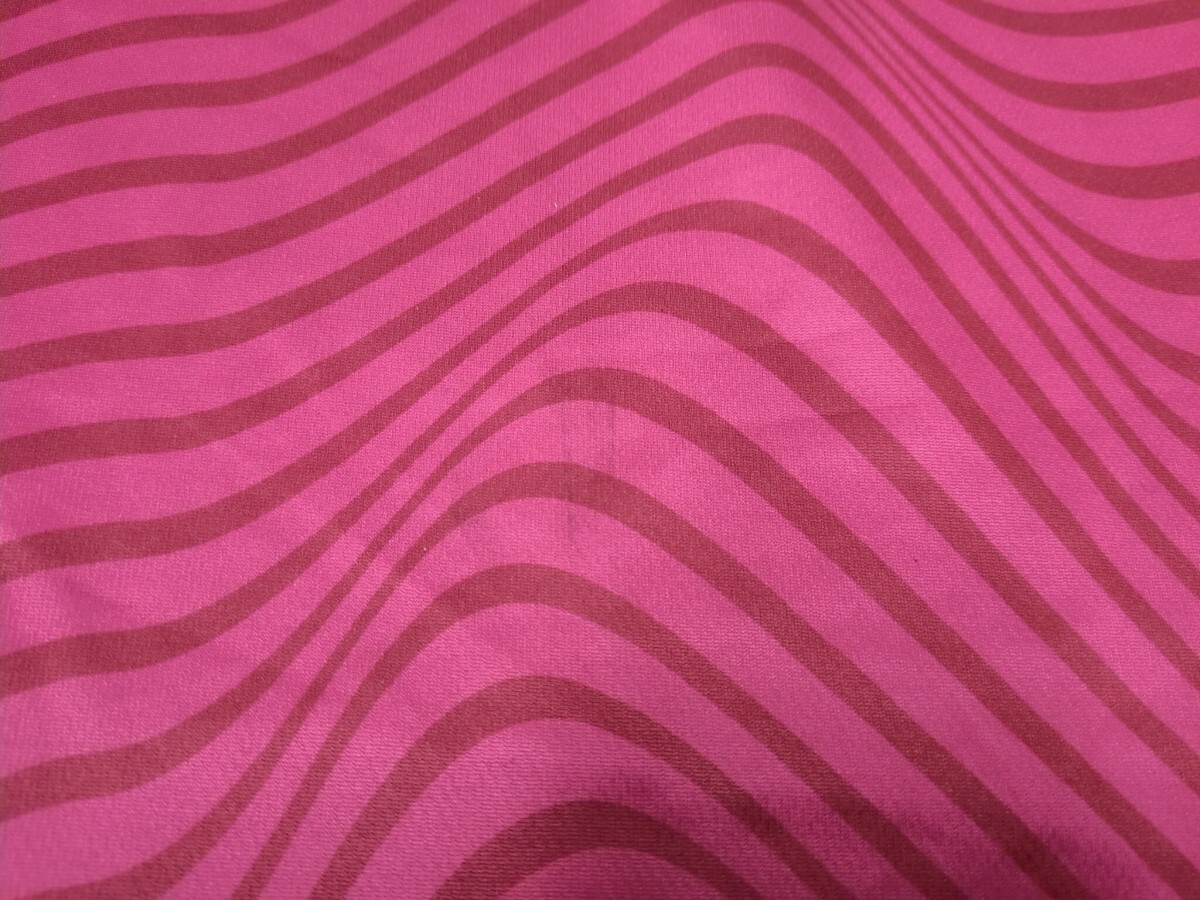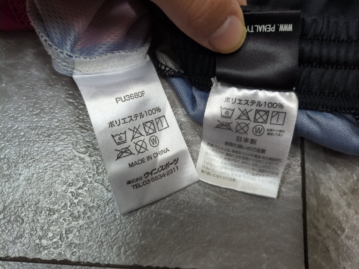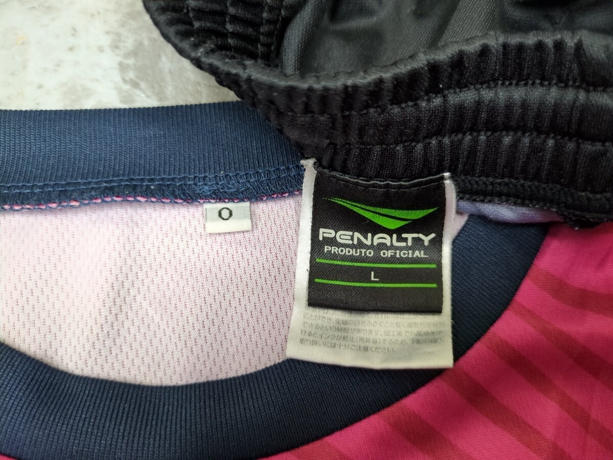 | メンズ上O、下L。色はピンク系黒 上 フロント中央、バック下部に汚れ。生地の質感状態良好です。 下 使用感あり。糸つり箇所あり |