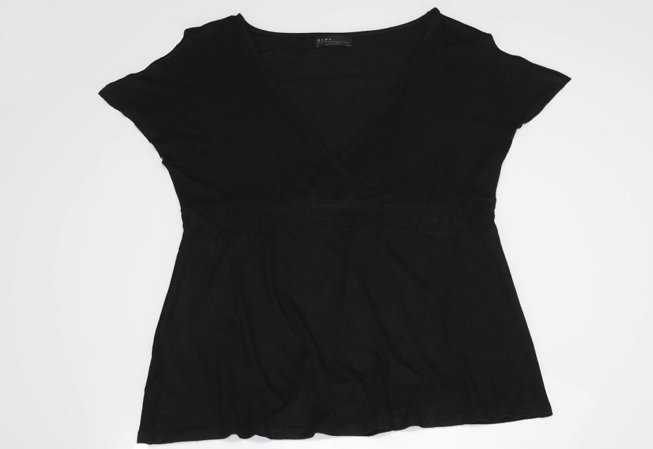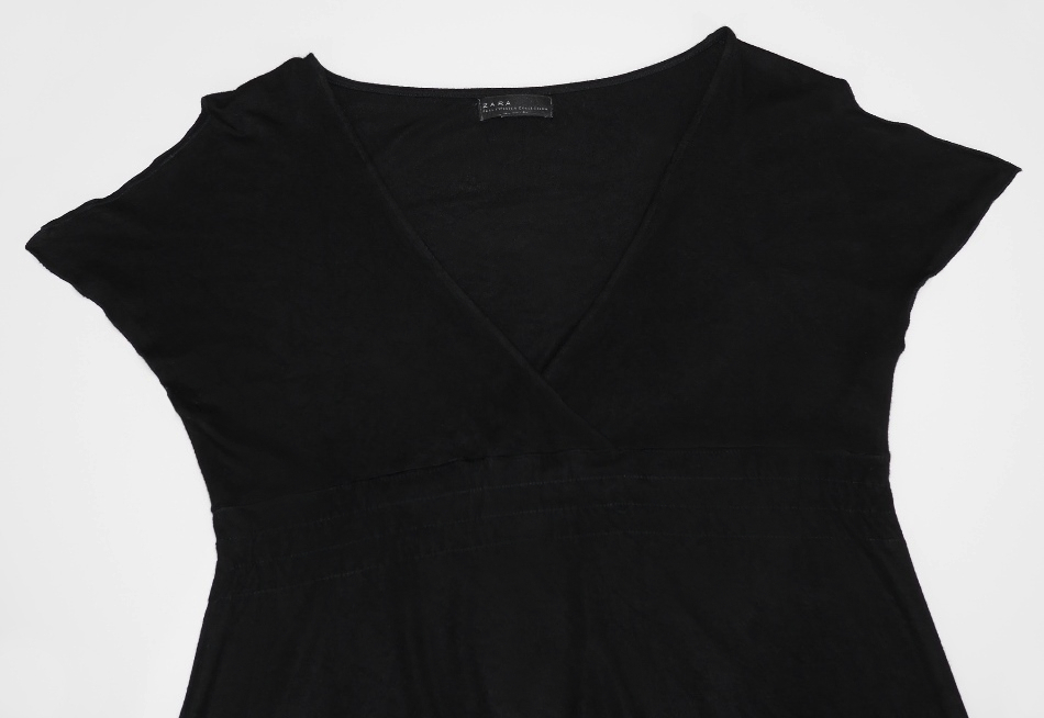 2年前に銀座のZARAで購入しました。5,900円でした。深めのVネックと肩が開いているので女性らしいです。