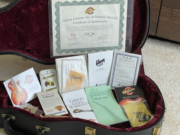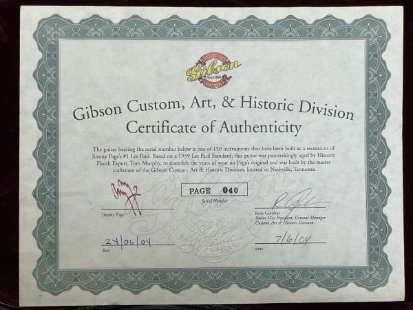 ジミー・ペイジのサインが入れられた、専用のカスタムショップ・サティフィスケイト等の付属品とオリジナル・ハードシェル・ケースが付属します